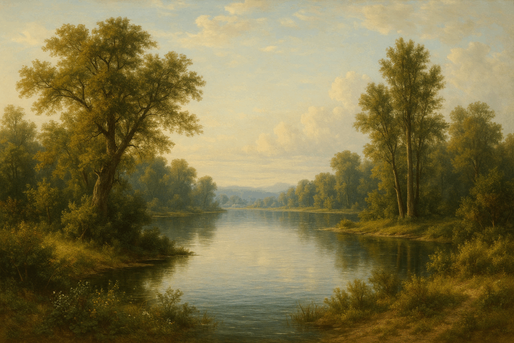 A peaceful, empty river scene filled with tall trees and soft light. The land seems untouched, before colonization—or perhaps after. A silent witness to what came before and what will remain long after. Perfect for transitional placement or reflection.