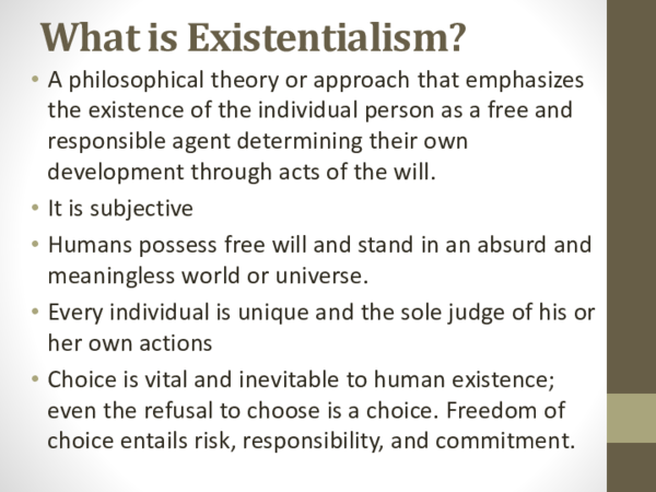 - Existence Precedes Essence: Individuals are not born with a predetermined purpose. Instead, people create their meaning through their actions and choices.
