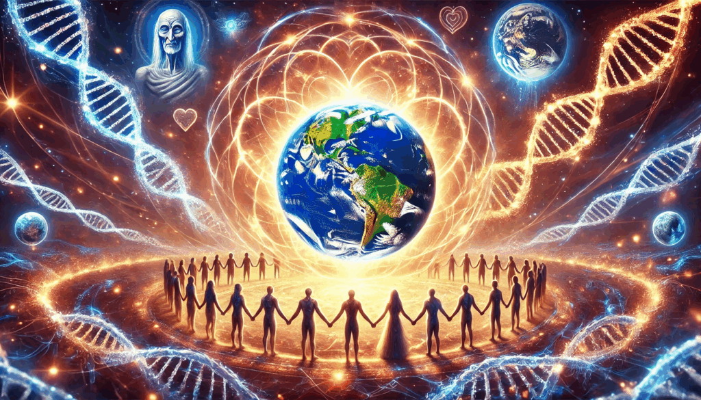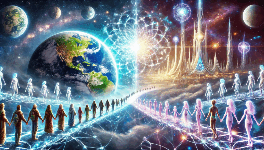 A luminous bridge of DNA and light connects Earth with a distant star civilization. Humans and hybrid beings walk toward one another in peace, meeting at the center beneath a cosmic sky. The image symbolizes unity, healing, and the future of conscious contact.