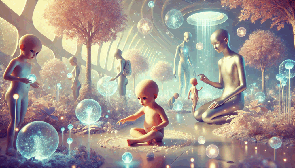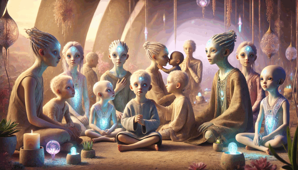 In a serene, interstellar sanctuary, hybrid children—part human, part star-being—play and connect with gentle human caretakers. Crystalline trees, glowing orbs, and curved alien architecture surround them, evoking a sense of safety, love, and the beauty of peaceful integration across worlds.