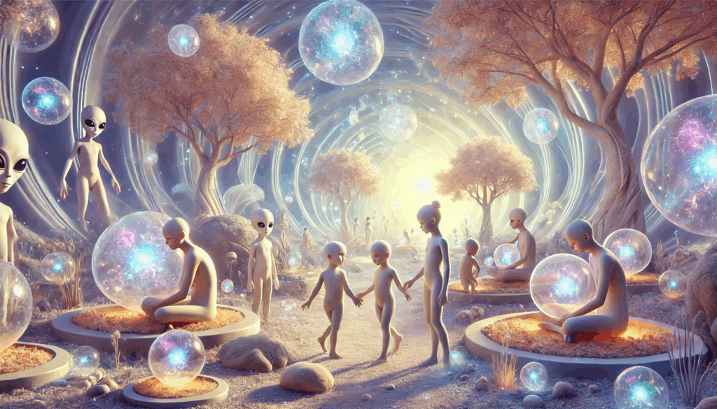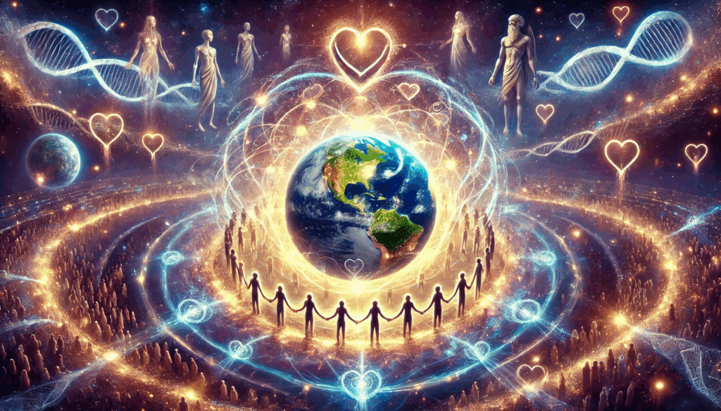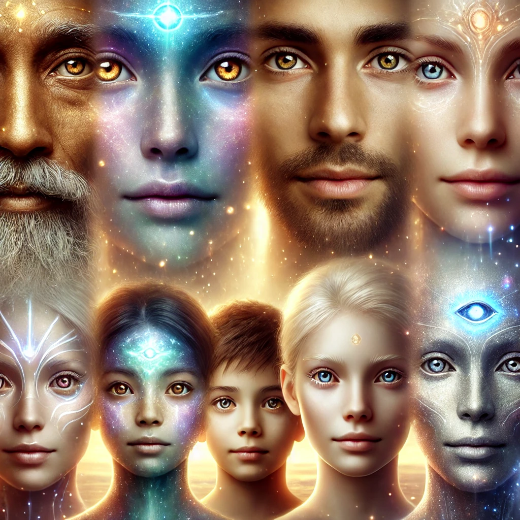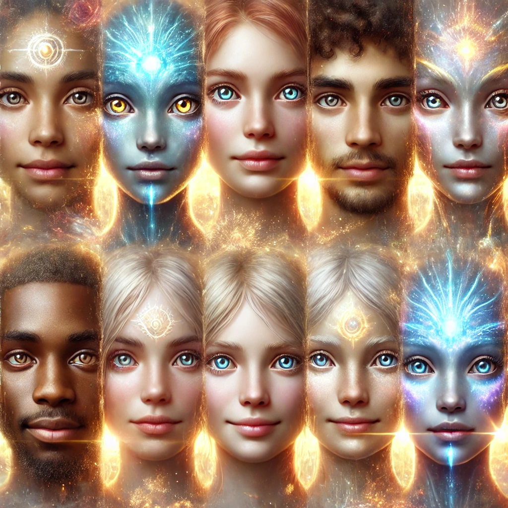 Humans and hybrid beings gaze gently into the camera—young and old, luminous and grounded, Earth-born and star-blended. Their faces radiate kindness, diversity, and a sense of belonging. In their eyes: peace, memory, and the quiet power of a united future.