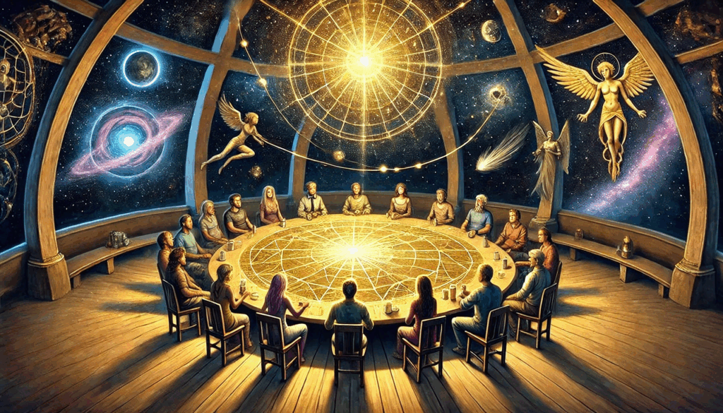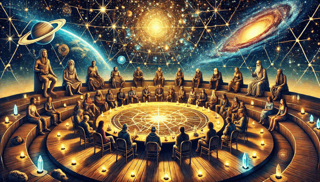 Beneath a starlit dome, a diverse circle of seekers—channelers, researchers, experiencers, and healers—engage in deep dialogue. Threads of golden light link them, revealing moments of shared truth, tension, and evolving understanding. The scene honors discernment without judgment, and difference without division.