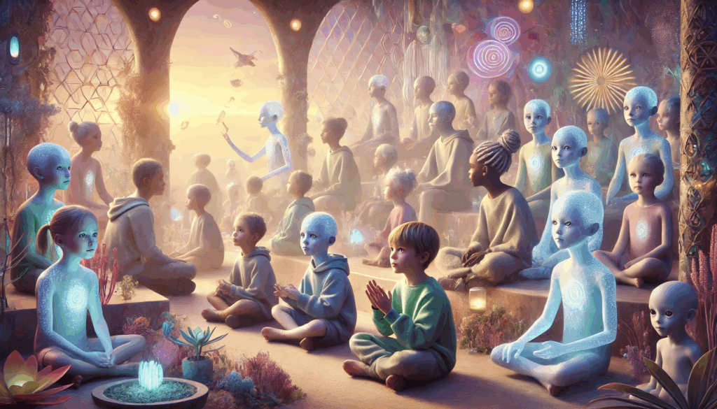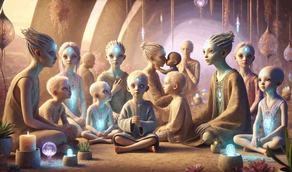 In a luminous sanctuary, hybrid children rest and reach out with quiet grace. Their eyes reflect both emotion and ancient wisdom. Surrounded by soft light and gentle beauty, they radiate peace, vulnerability, and telepathic love, reminding us that they are not threats, but tender bridges in our shared story of becoming.