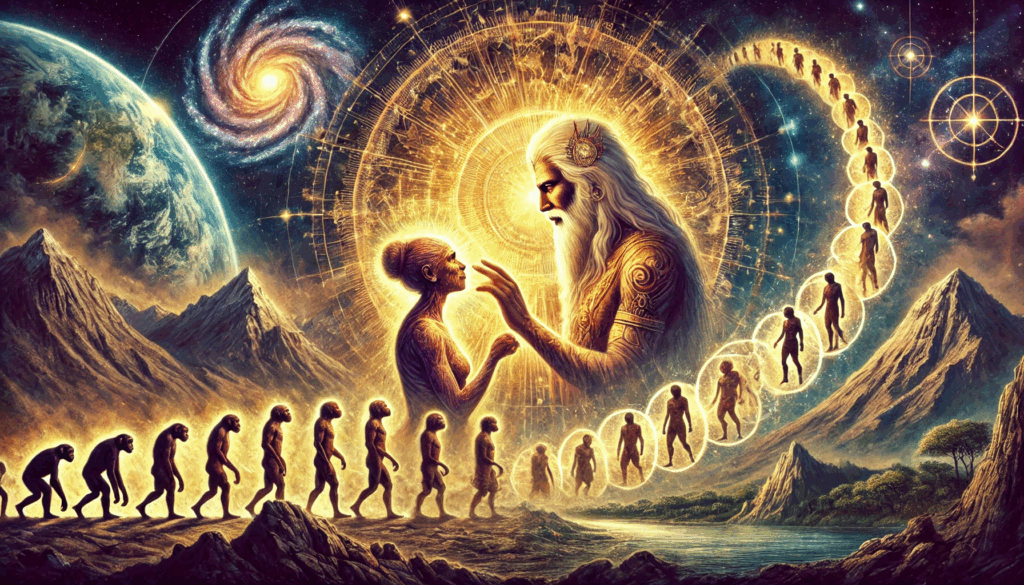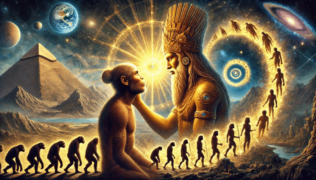 In a luminous, ancient world where Earth meets the stars, a noble Anunnaki gently connects with Homo Erectus, transmitting light and life. Their union sparks a spiral of evolution behind them—a sacred fusion of Earth and cosmos, of animal and angel—humanity, born not of conquest, but of courageous devotion.