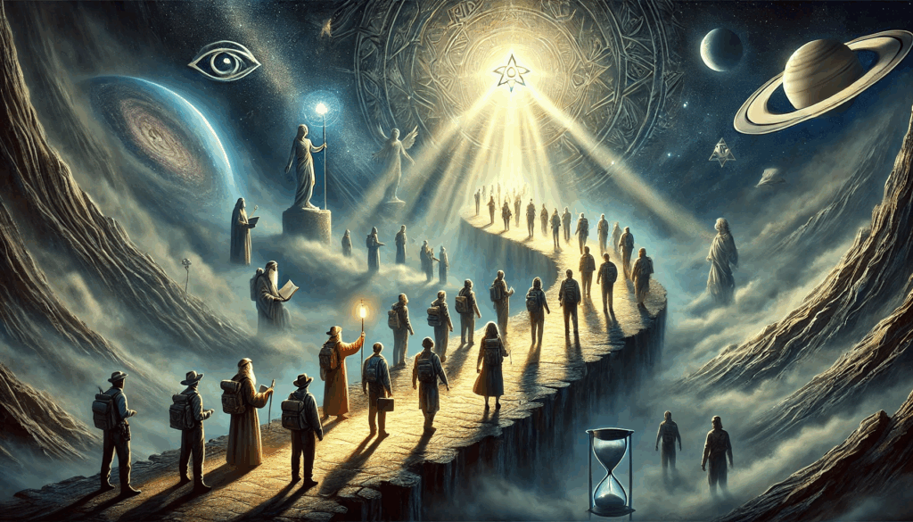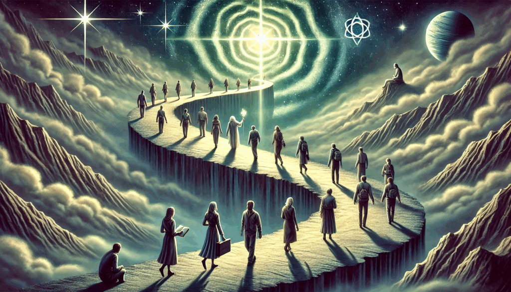 A winding, luminous path cuts through shadows and stars, walked by courageous seekers, researchers, experiencers, therapists, whistleblowers, and guides. Some carry knowledge; others lean on each other. Above, a guiding light shines through the unknown. The journey is perilous—but it is sacred.