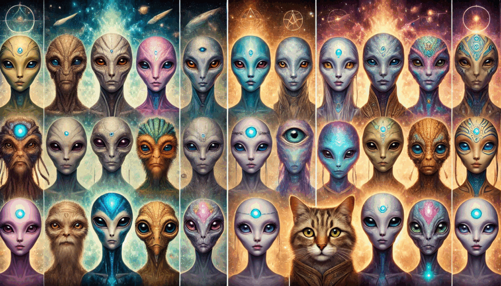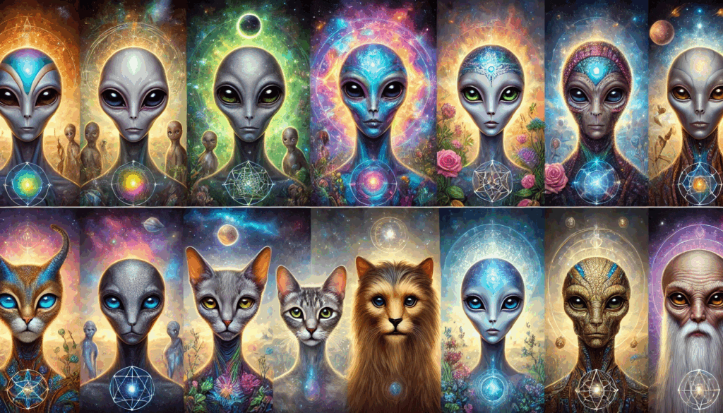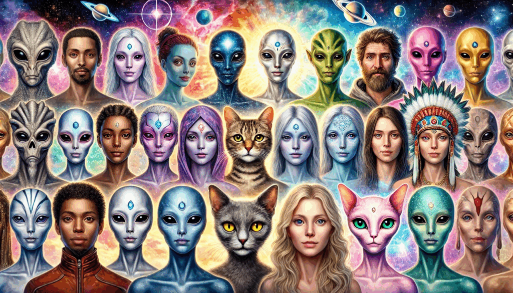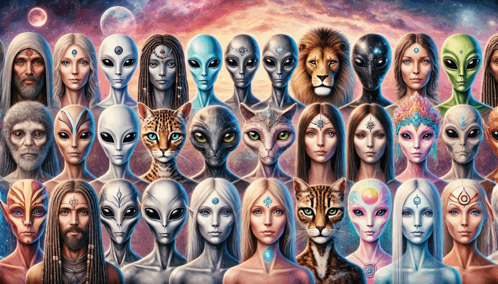 In these portraits, six diverse hybrid and extraterrestrial beings gaze gently forward—grays, reptilians, light-beings, feline and insectoid species—all rendered with detail and dignity. These faces remind us: peace begins with recognition, and contact begins with compassion.