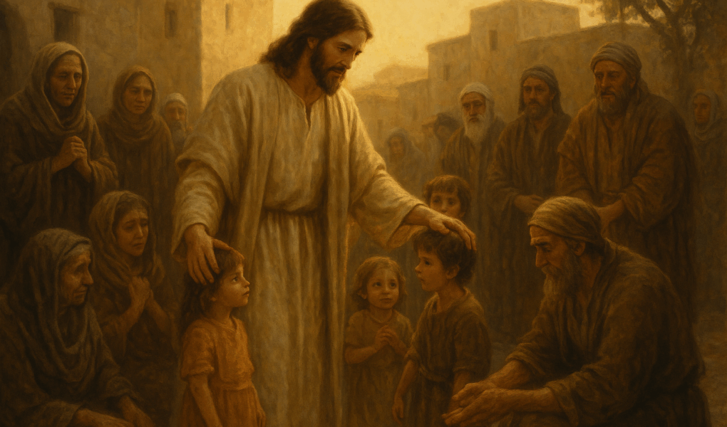In the quiet glow of the setting sun, Jesus moves among the humble people of an ancient village. His hands rest gently upon the heads of children, offering blessings of love and reassurance, while a beggar kneels before him with gratitude and hope. Around them, men and women watch in reverent silence, their faces touched by the same golden light that radiates from him. This moment captures the essence of his message — tenderness, humility, and the power of compassion to heal all divisions.