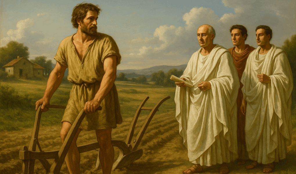 Cincinnatus grips his wooden plow in a rustic field as Roman envoys approach, scroll in hand. The contrast between his humble life and their formal togas marks the moment he is summoned to save the Republic.