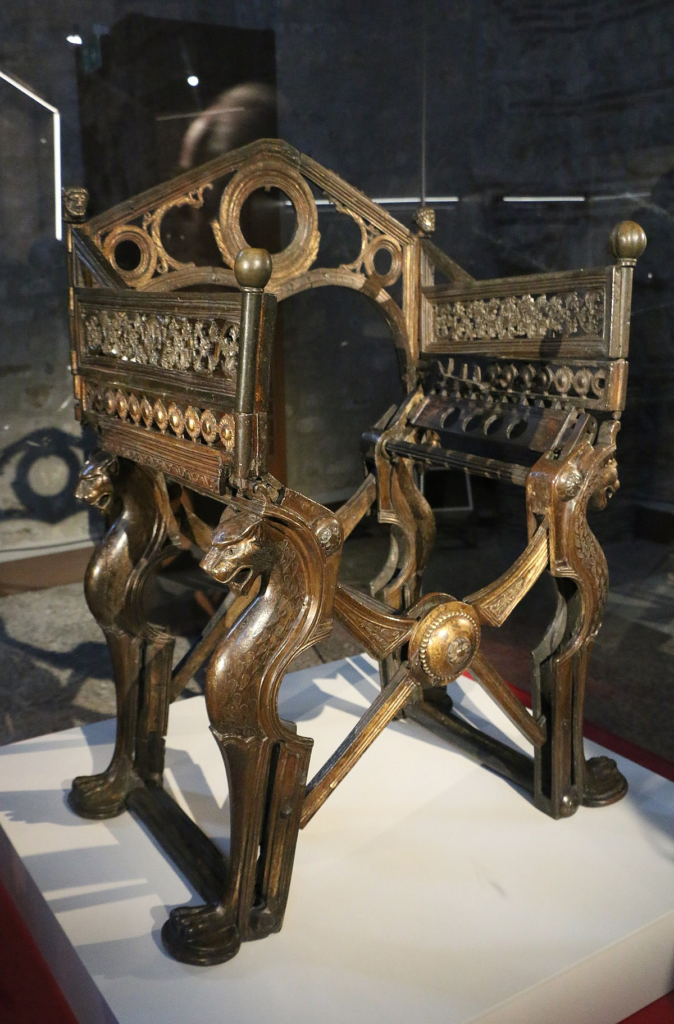 “Throne of Dagobert“, bronze. The base, formed by a curule chair, is traditionally attributed to Dagobert, while the arms and the back of the chair were added under Charles the Bald. This throne was last used by Napoleon I in 1804 when he created the Légion d’Honneur.