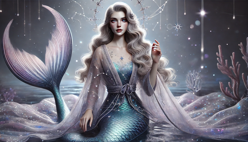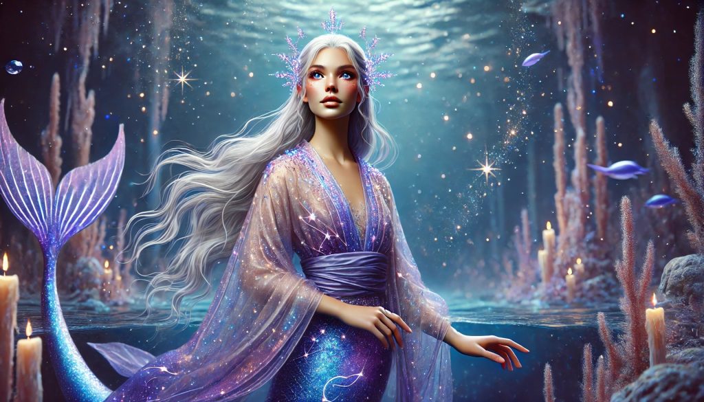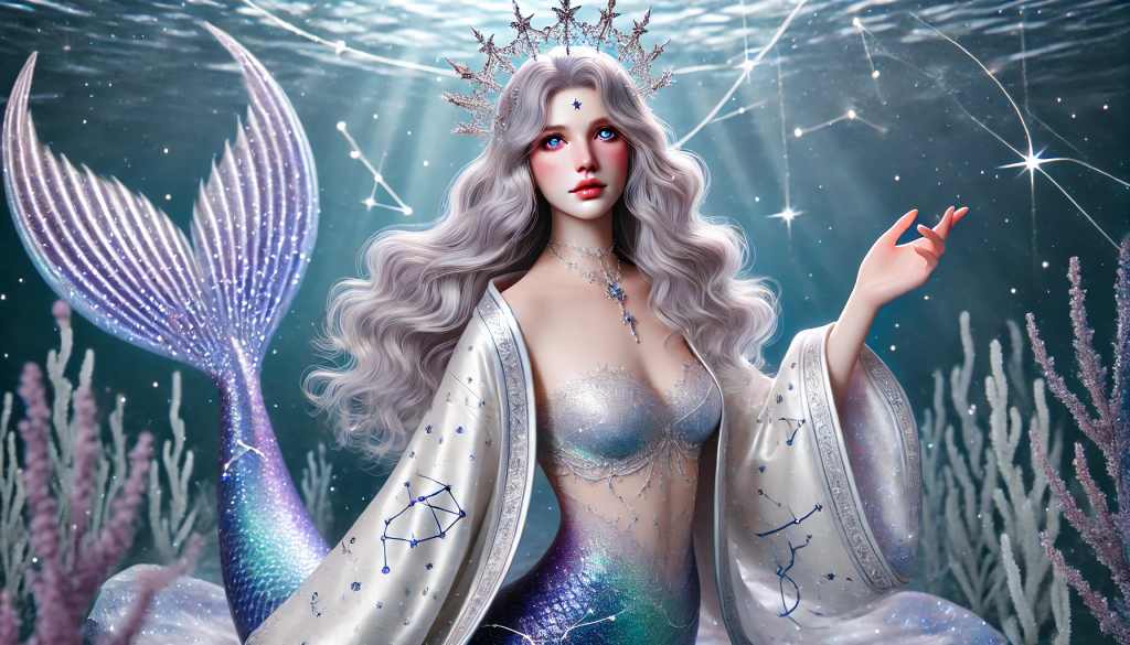 Her mermaid tail is shimmering midnight-blue with constellations woven into the scales, glowing softly as she moves.