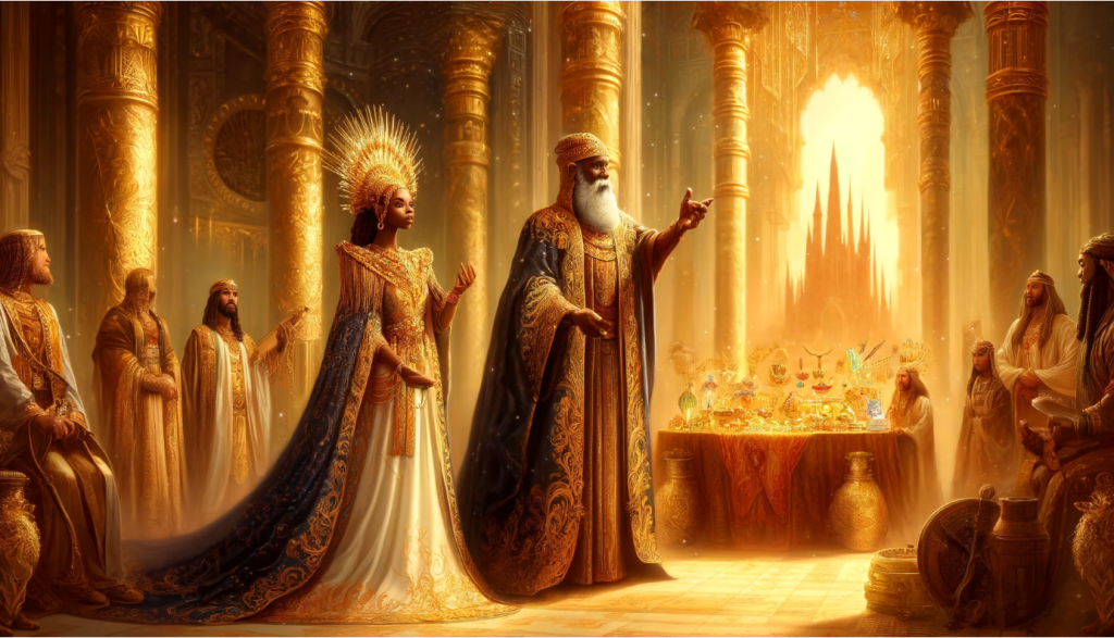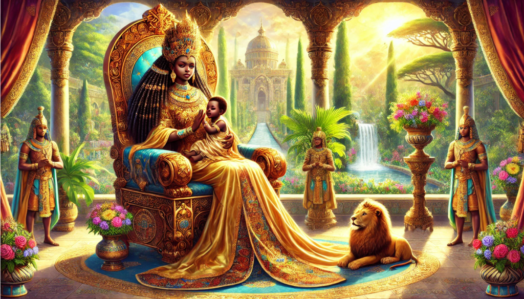 According to Ethiopian tradition and the Kebra Nagast (The Glory of Kings), King Solomon of Israel is the father of Makeda’s child, Menelik I. The story tells of when Makeda visited Solomon in Jerusalem for wisdom. They developed a close bond during her stay, and she returned to Ethiopia bearing his child.