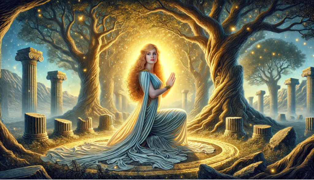 One fateful evening, during a festival under the silvery glow of a full moon, Olympias ventured into a sacred grove near the royal palace. The grove, a sanctuary of towering oaks and ancient stones, was where mortals and gods could commune. The air was rich with the aroma of myrrh and pine, alive with the hum of cicadas and the soft glow of fireflies. As Olympias knelt in quiet reverence beneath an ancient oak, a celestial light enveloped the grove, bathing the trees in golden brilliance.