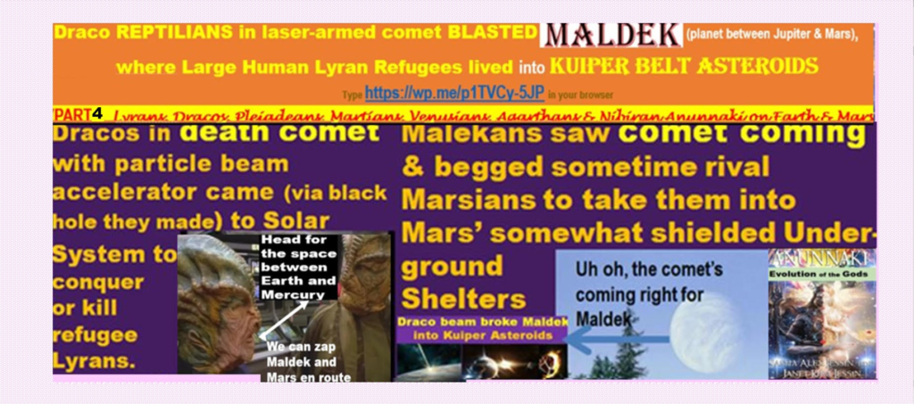 Draco REPTILIANS in laser-armed comet BLASTED MALDEK (planet between Jupiter & Mars), where Large Human Lyran Refugees lived into KUIPER BELT ASTEROIDS (Part 4 Lyran Refugee series) https://wp.me/p1TVCy-5JP for more of the story From ANUNNAKI EVOLUTION OF THE GODS* by Sasha Alex Lessin, Ph.D. (Anthropology, UCLA) & Janet Kira Lessin (CEO, Aquarian Media) Backstory: Four billion years ago, most Lyran System humans fled to 110 scattered planets (in Orion, Tau Ceti, Pleiades, Procyon, Antares, Alpha Centauri, Aquarius & other star systems) to escape Draco Reptilians from Thuban (Alpha Draconis). The Lyrans federated to fight the Dracos.