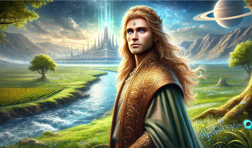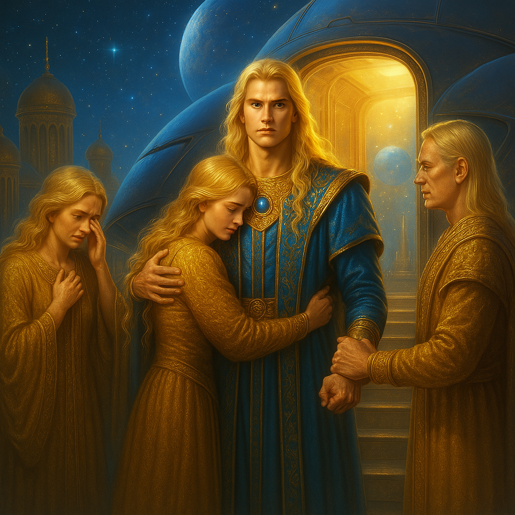 In this emotionally charged and luminous scene, Ea—the first avatar of Enki—stands tall at the threshold of his celestial ship, preparing to descend to Earth. His radiant golden-blonde hair and sapphire eyes shimmer with divine purpose. Draped in royal blue and gold, his presence exudes nobility and sorrow. Wrapped in a silent embrace with Damkina, whose love anchors him to Nibiru, he prepares to leave behind all he knows. To his right, his mother, Ninul, wipes away tears, sensing the weight of destiny upon her son. Anu, the sovereign of Nibiru, offers a final touch of blessing, stoic yet tender. Behind them, the luminous palace domes of Nibiru stretch toward a star-studded sky as twin moons rise. This moment marks the beginning of a cosmic mission that will change the fate of Earth—and the gods—forever.