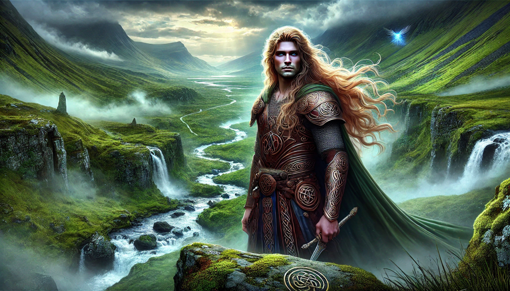 A stunning, landscape-format, fantasy-style illustration of Fin (Fionn mac Cumhaill) standing amidst the mist-laden glens of ancient Ireland. The lush, rolling emerald hills and mystical rivers create a breathtaking scene, where the air hums with divine energy. Fin is a mighty yet wise warrior, his eyes reflecting deep knowledge from the cosmic architect, Enki. His elaborate Celtic armor, adorned with knotwork, shimmers under an ethereal light. The wind carries whispers of gods, and an otherworldly aura surrounds him, reminding all that Fin is more than legend—he is a guardian of humankind, a bridge between mortals and the divine.