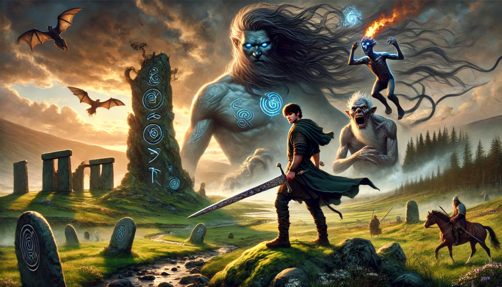 A breathtaking, realistic, and artistic fantasy-style illustration of Fin (Fionn mac Cumhaill) at the height of his legendary struggles. Fin stands strong, wielding a Celtic sword inscribed with ancient runes, his blue eyes gleaming with intelligence and power. Around him, the towering giant Benandonner looks confused, ensnared in Fin’s cunning trickery. In the background, a fire-breathing demon roars, its flames casting an eerie glow across the misty Irish landscape. At the edges of the battlefield, dark spirits of the Otherworld swirl, their spectral tendrils reaching toward the realm of men. The land itself pulses with mystical energy, shaped by Fin’s victories. This scene captures the balance of struggle, triumph, and mystery, as Fin walks the line between man and divinity, an avatar of Enki, protector of his people and shaper of destiny.