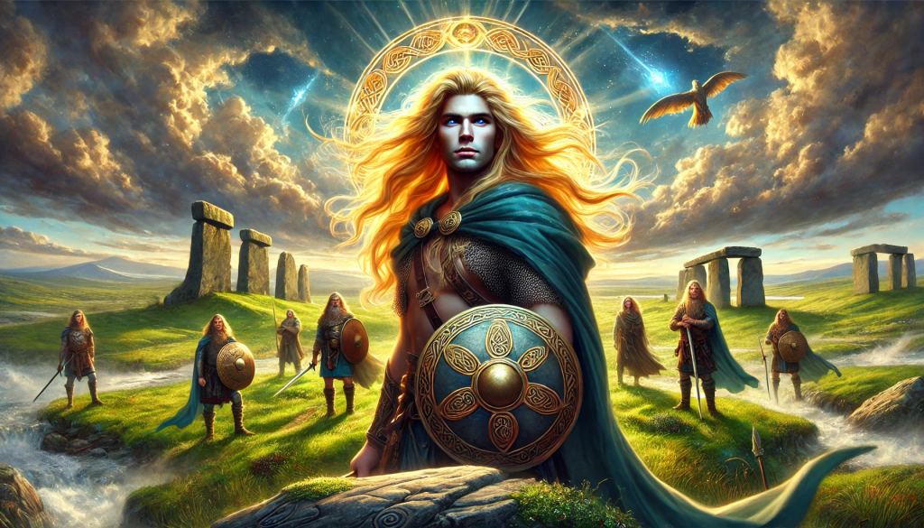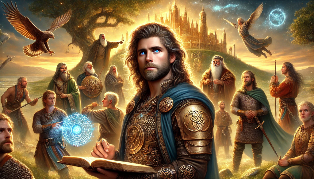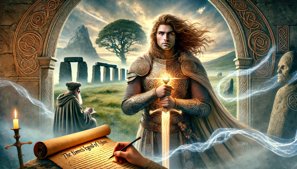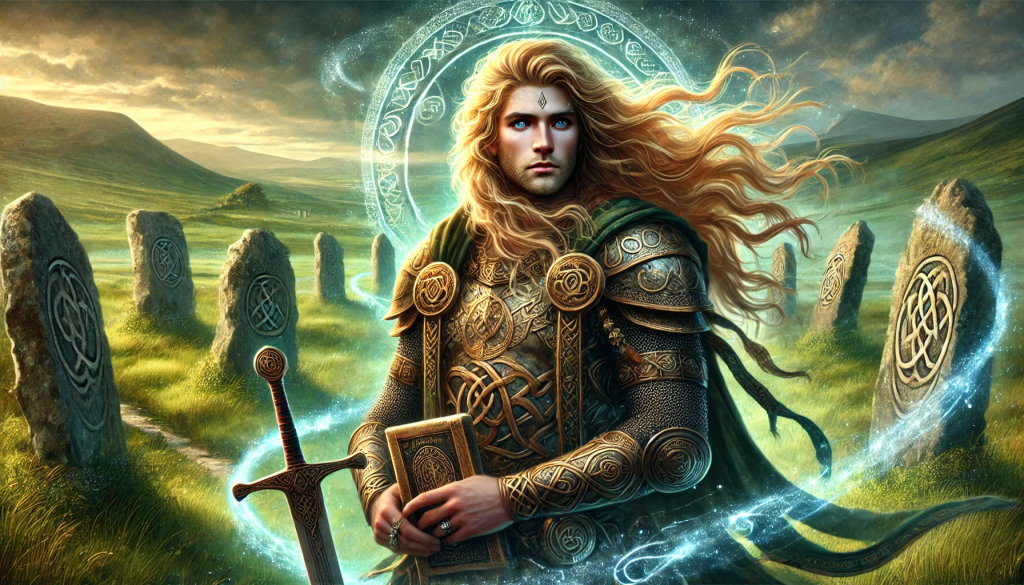 Description: Fin stands at the threshold of history and myth, his golden hair flowing in the wind, piercing blue eyes gazing forward with quiet intensity. Clad in ornate Celtic armor, he grips a glowing sword, symbolizing his legendary status. Behind him, two worlds converge—an ancient Irish landscape of standing stones and misty hills on one side, and a medieval scribe inscribing Fin’s story onto parchment on the other. Ethereal light swirls around him, hinting at the possibility that Fin never truly died but instead entered an enchanted sleep, waiting for the time of his return. This image embodies the mystery of his legend, where history and mythology intertwine, ensuring that his tale will never fade from memory.