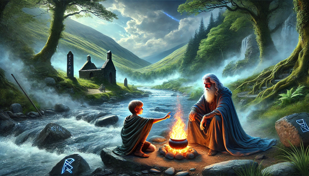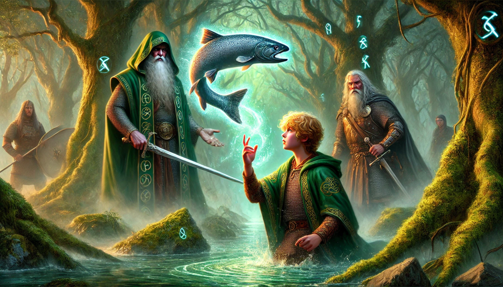 This breathtaking, realistic, and artistic fantasy-style landscape illustration captures the pivotal moment of young Fin (Fionn mac Cumhaill) experiencing enlightenment as he touches the legendary Salmon of Wisdom.
