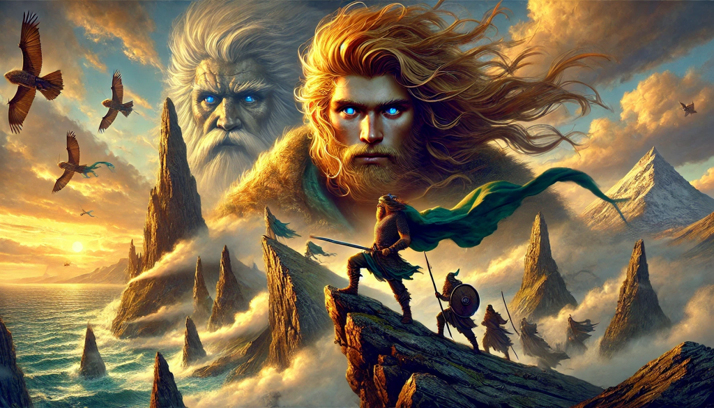 This breathtaking, realistic, and artistic fantasy-style illustration captures Fin (Fionn mac Cumhaill) in the heat of his legendary exploits. He stands atop a towering cliff, a commanding presence with his golden hair flowing in the wind, his piercing blue eyes glowing with wisdom and divine power. More than a warrior, Fin is a seer, a protector, and a force of nature—an avatar of Enki, shaping the land and guiding his people. Around him, the Fianna warriors stand at the ready, their shields gleaming as they prepare for battle. In the distance, a colossal giant looms, casting an ominous shadow over the land. But Fin does not falter—he has carved rivers with his footsteps and shaped mountains with his hands, leaving his mark upon the world. The air crackles with supernatural energy, as history, myth, and magic collide in an epic moment of destiny. A storm brews above, yet divine light breaks through the clouds, illuminating Fin and his warriors, as if the heavens acknowledge their mission. This is Fin, the Titan-Slayer, the Guardian of the Fianna, and the eternal protector of his people—a warrior whose legend will never fade.