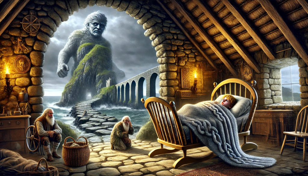 The scene shows Fin disguised as a massive infant, swaddled in woven blankets inside a stone-built Celtic home. His golden hair and piercing blue eyes are barely visible as he feigns sleep. At the entrance, Benandonner, a towering and menacing figure, gazes at the supposed ‘baby’ in utter shock and fear, realizing that if this is Fin’s child, the father must be an even more massive and terrifying opponent.