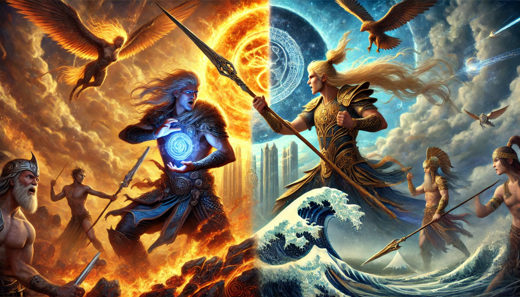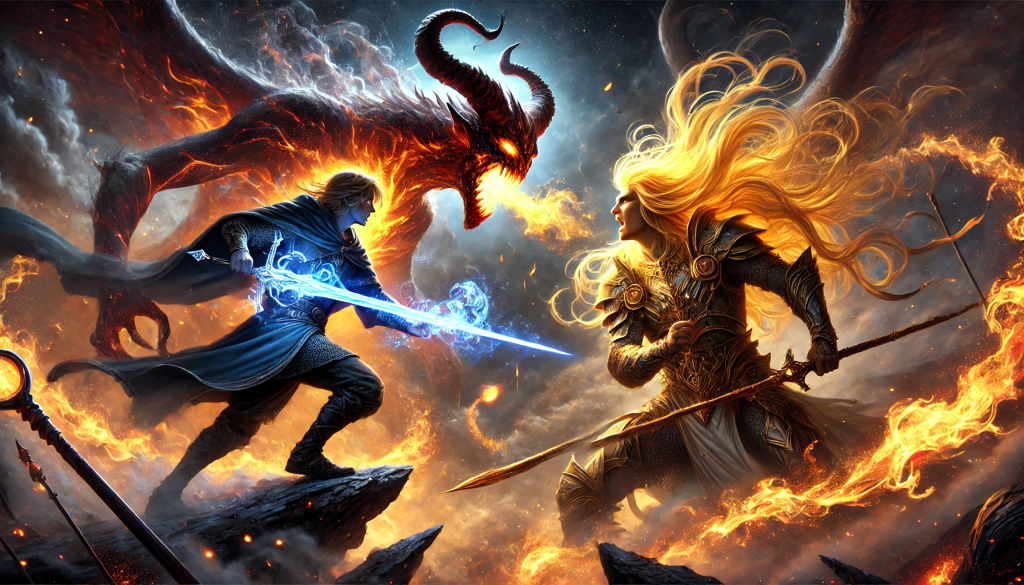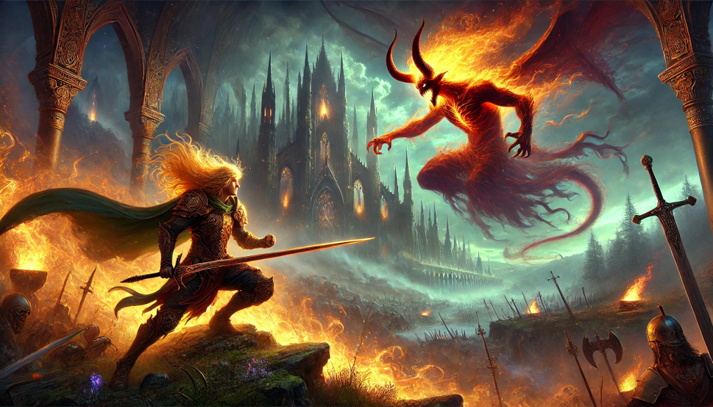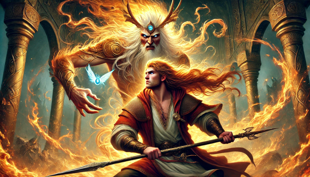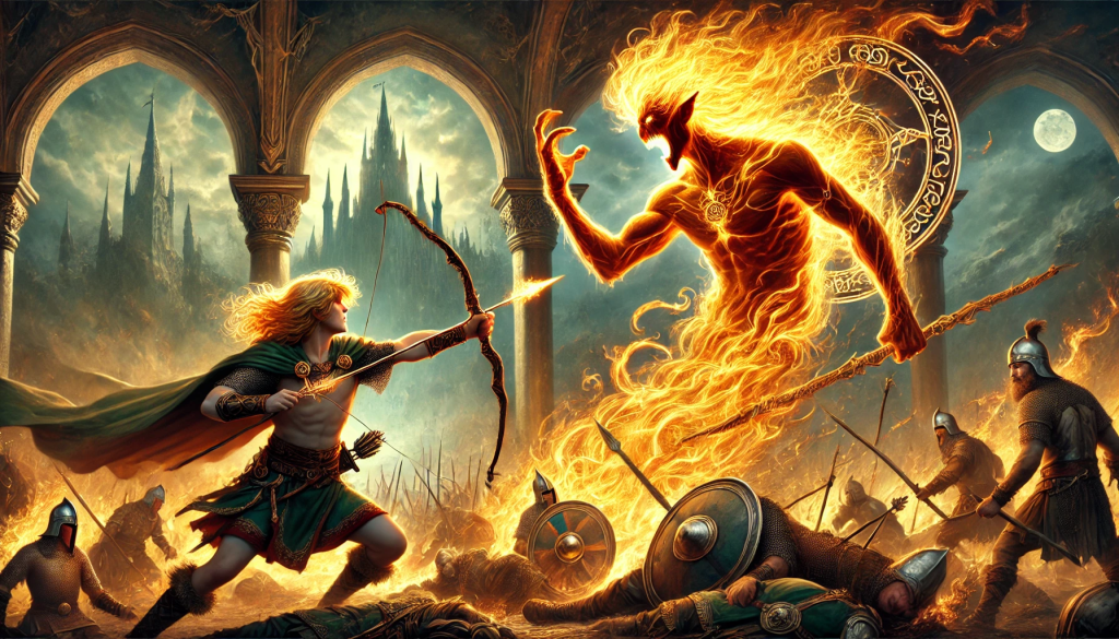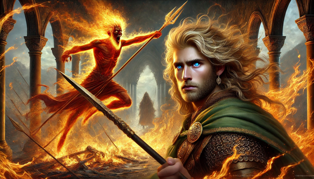 In a fiery clash of legend, Fin, a noble warrior with flowing golden hair and piercing blue eyes, stands firm against Aillen, the fearsome fire demon. The battlefield is engulfed in swirling smoke and flames beneath a dark, mystical sky. Aillen, wreathed in fire, unleashes a torrent of flame, yet Fin remains undeterred, gripping his enchanted spear tightly. The magical weapon glows with power, keeping him awake against Aillen’s sleep-inducing magic. Embers illuminate the scene as Fin presses forward, ready to strike a decisive blow. This moment captures the legendary battle of courage, magic, and destiny.