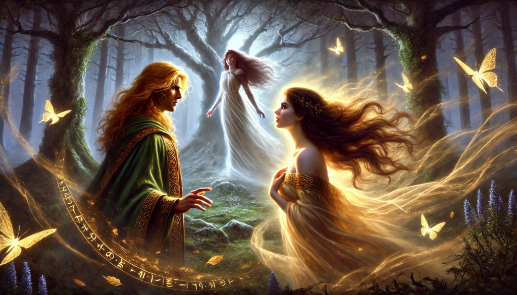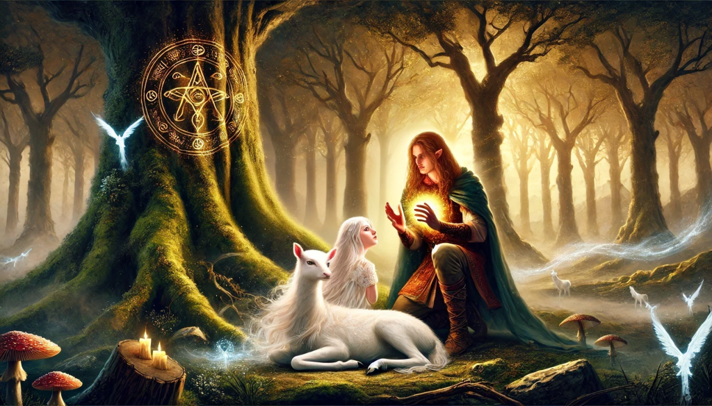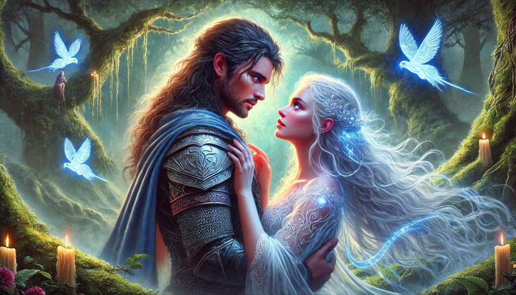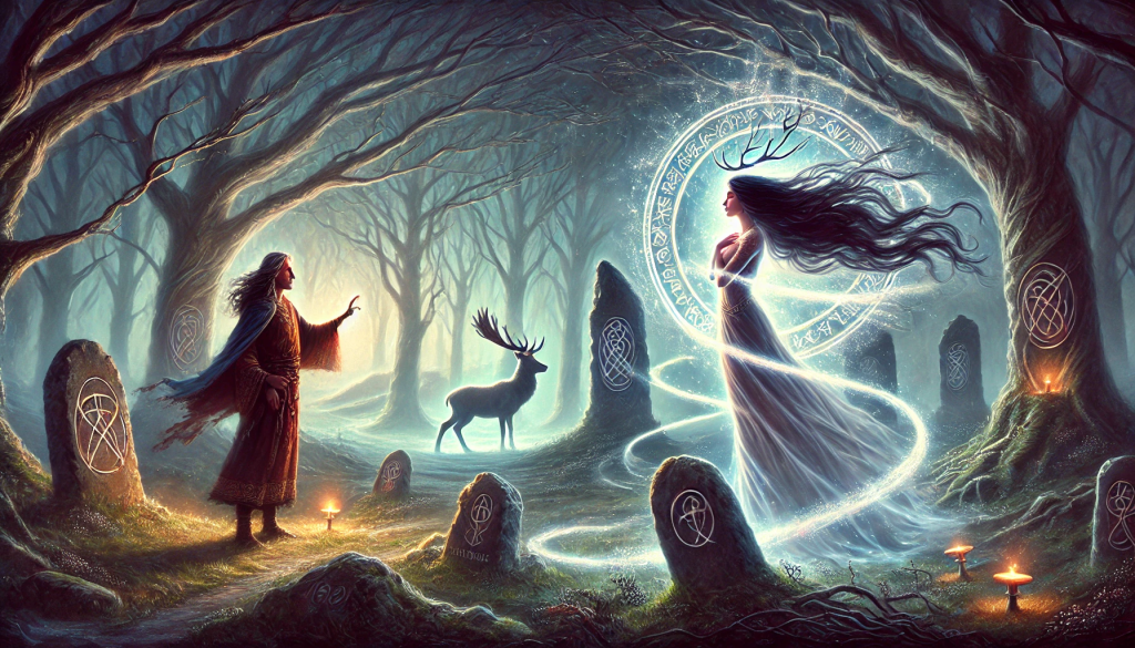 This breathtaking, realistic, and artistic fantasy-style illustration captures the legendary love story of Fin (Fionn mac Cumhaill) and Sabh in an enchanted Celtic forest. Fin, a firm yet gentle warrior with golden hair and piercing blue eyes, kneels beside a majestic white deer, his hands radiating warmth as he restores Sabh to her human form. The air shimmers with magic as her transformation unfolds. Her delicate features emerge from the fading enchantment, now fully detailed, including both visible ears. The ancient trees, bathed in soft golden light, tower over them, their bark glowing with mystical Sidhe symbols, marking the presence of Otherworldly power. Yet, hidden in the distance, a shadowy druid lurks at the edge of the trees, his dark eyes watching. He plots to reclaim Sabh and drag her back into the Otherworld, ensuring their love remains fleeting and tragic. The scene perfectly blends love, transformation, and sorrow, capturing Fin’s divine essence as an avatar of Enki, whose love and wisdom challenge even the most powerful enchantments.