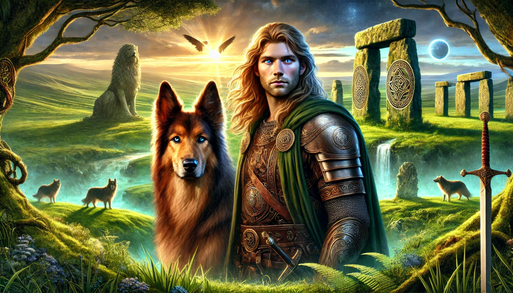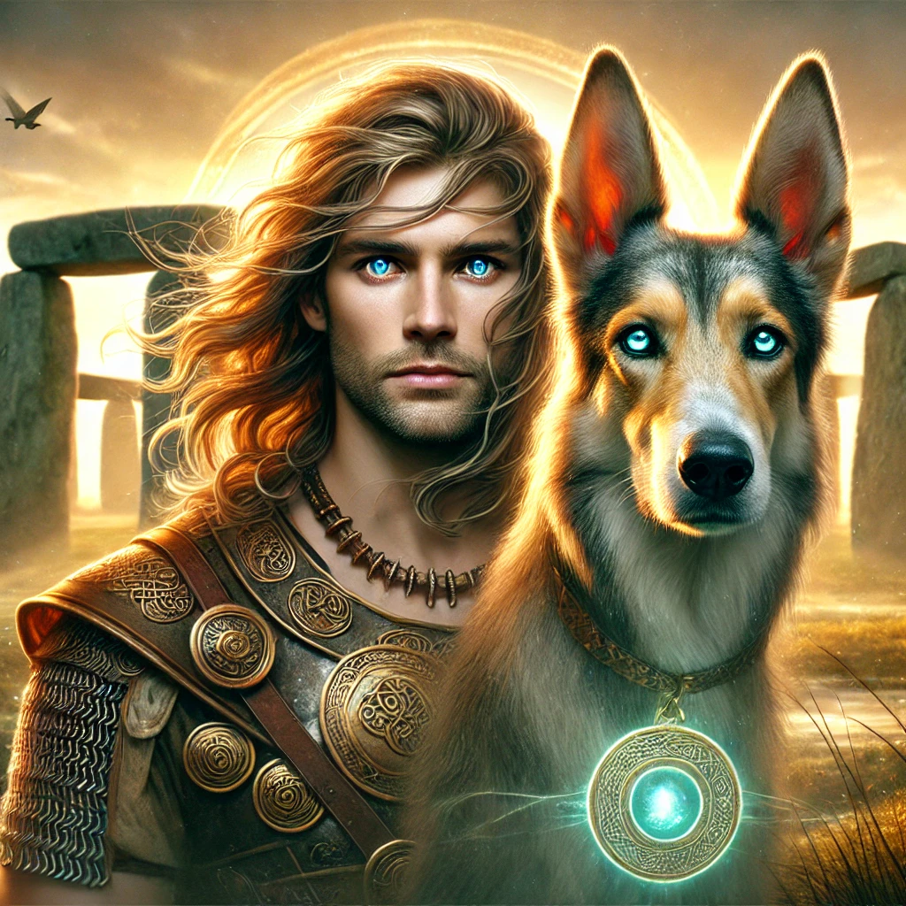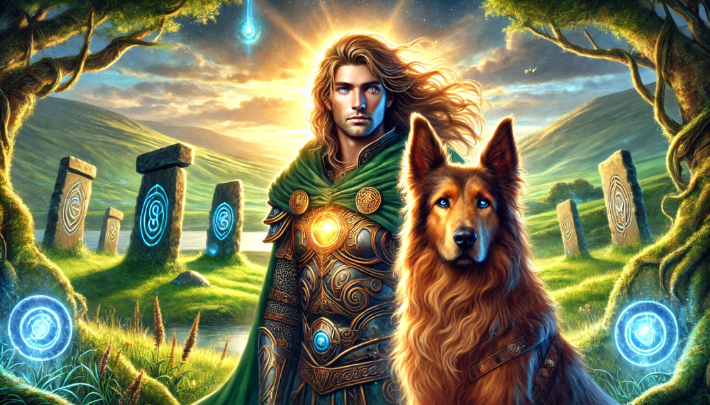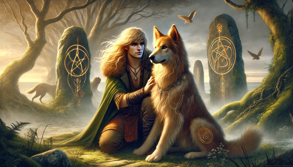 This breathtaking, realistic, and artistic fantasy-style illustration captures the tragic yet mystical tale of Fin (Fionn mac Cumhaill) and his enchanted hound, Bran. In a misty Celtic landscape, Fin, a noble warrior with long, flowing golden hair and piercing blue eyes, kneels beside Bran, a majestic hound with an ethereal glow, his fur shimmering with supernatural energy. Fin’s expression is filled with love and unspoken understanding, unaware that Bran is his son, Oisín, transformed by the magic of the Sidhe. The background features ancient standing stones inscribed with glowing mystical symbols, hinting at the faery origins of Bran’s transformation. Soft golden light filters through the enchanted forest, casting an air of mystery, sorrow, and magic over the scene. This illustration captures the deep connection between Fin and Bran, symbolizing Fin’s compassion and bond with the human and magical realms. Fin unknowingly raises and loves his son in hound form.