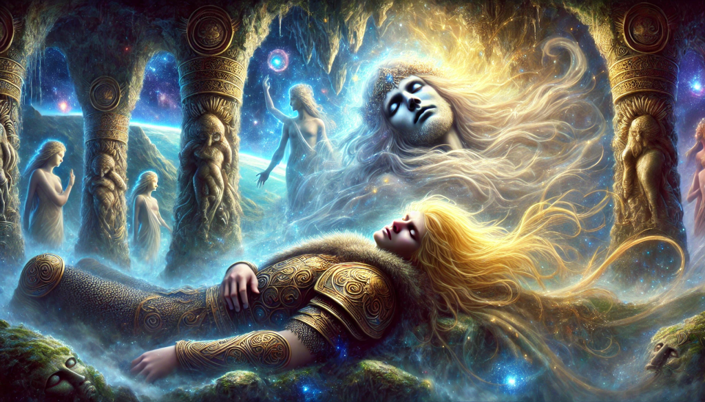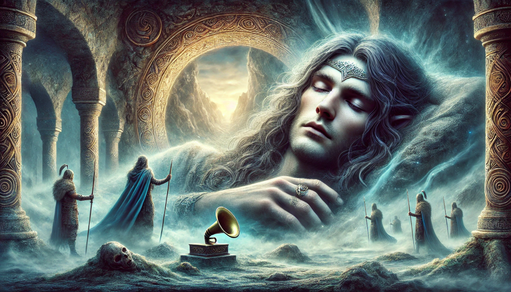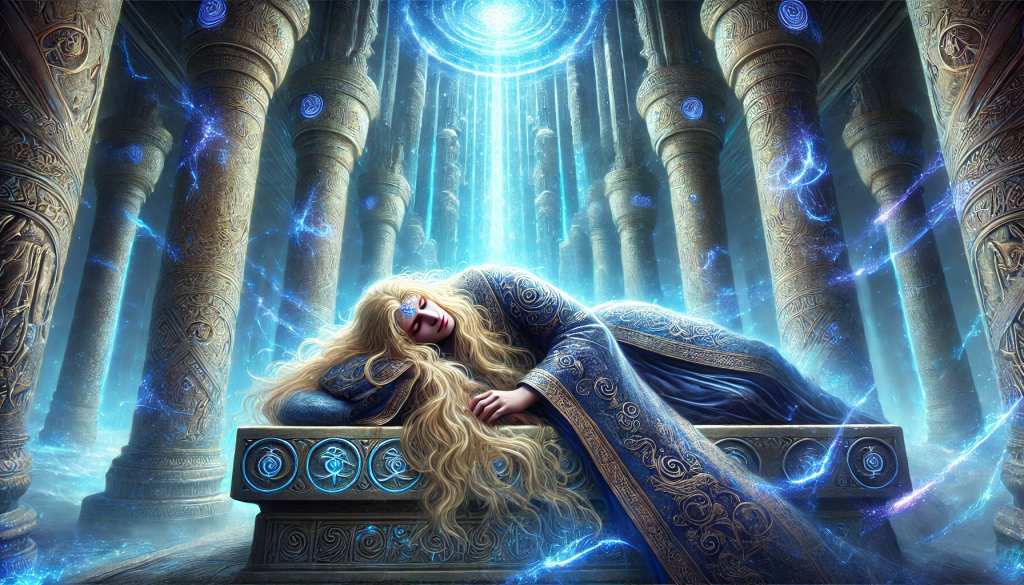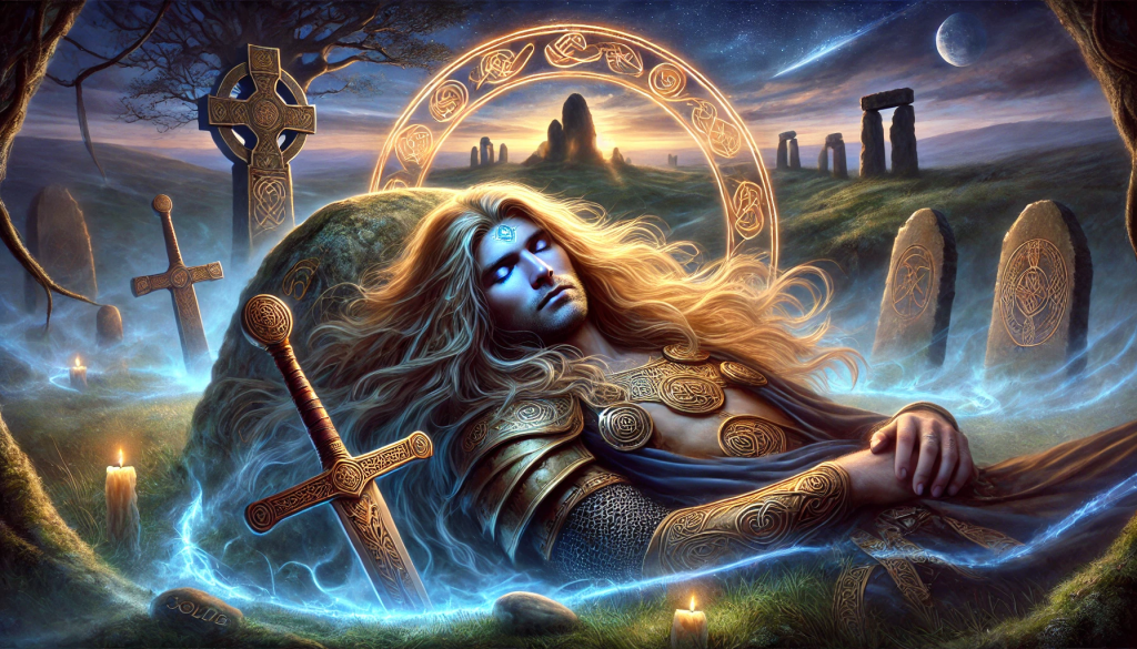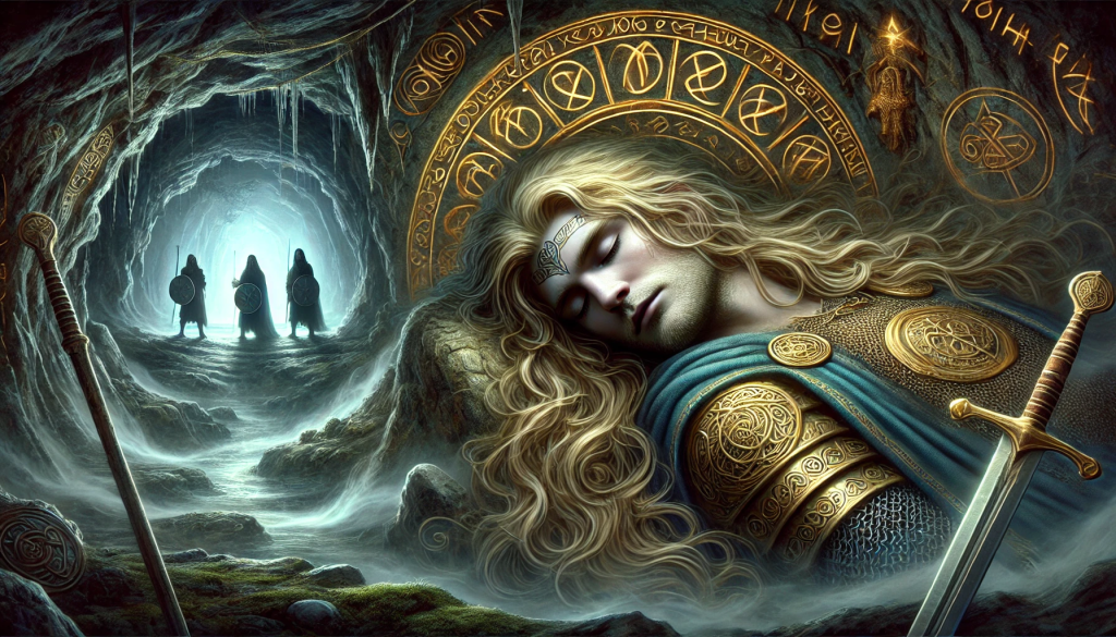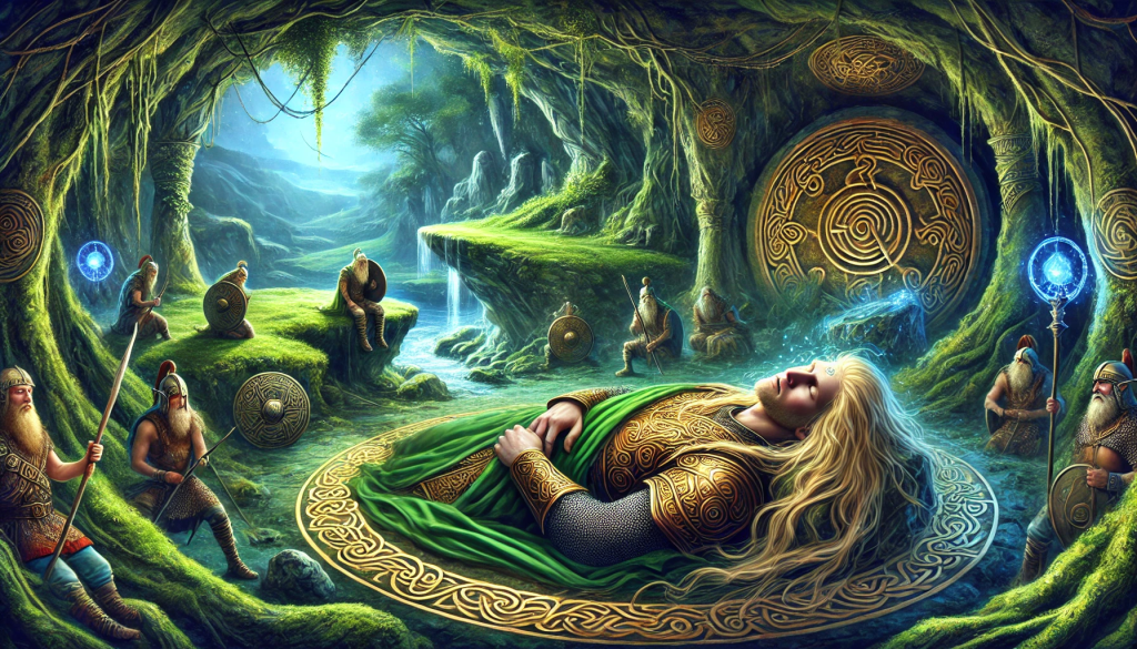 This breathtaking, realistic, and artistic fantasy-style landscape illustration captures the legendary slumber of Fin (Fionn mac Cumhaill) and his warriors in a hidden cave deep beneath the emerald hills of Ireland. Fin lies in enchanted sleep, his long flowing golden hair framing his peaceful face, while his intricately detailed armor gleams faintly in the cavern’s mystical glow. Surrounding him, the Fianna warriors rest, their weapons at their sides, as if waiting for the moment they must rise again. The cavern walls are etched with glowing Celtic symbols, emanating an ethereal blue-green light, hinting at the ancient magic preserving them. Vines and ancient roots creep down from the ceiling, marking the passage of time. At the same time, the air shimmers with supernatural energy, whispering of the prophecy that when Ireland is in peril, Fin and his warriors will awaken once more. This mirrors Enki’s eternal role as a protector and guide, ensuring that wisdom and guardianship never fade, only waiting for the right moment to return.