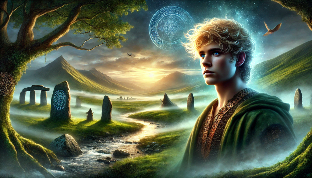 This breathtaking, realistic, and artistic fantasy-style landscape illustration captures the mystical beauty of ancient Ireland, where mist rolls over emerald hills, and rivers sing to the spirits of old. At the heart of the image, a young Fin (Fionn mac Cumhaill) stands, his golden hair glowing in the soft morning light. His piercing blue eyes reflect wisdom beyond his years, as he gazes over the wild, untamed land before him. The background features towering oak trees, ancient standing stones etched with glowing Celtic runes, and shadowy figures of legendary warriors watching over him, hinting at the epic destiny that awaits him.