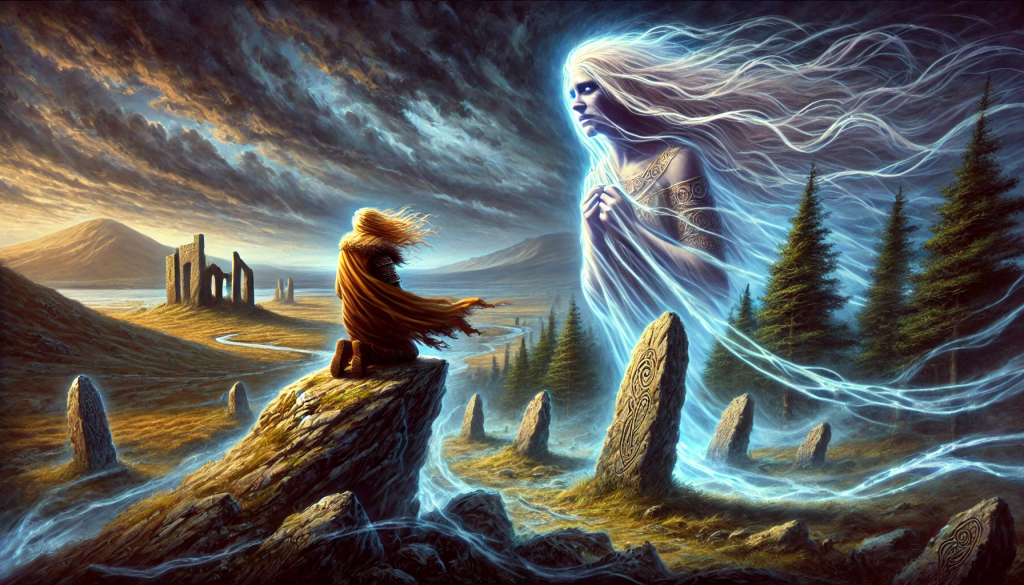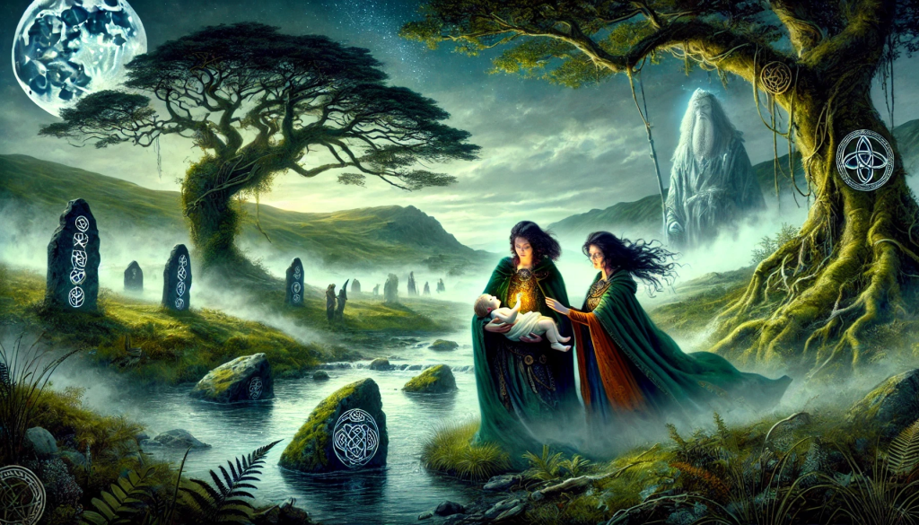 This breathtaking, realistic, and artistic fantasy-style landscape illustration captures Fin’s mystical and perilous origins (Fionn mac Cumhaill). In the mist-covered glens of ancient Ireland, where the rivers whisper of fate, two wise women—Bodhmall, a druidess in flowing green robes, and Liath Luachra, a fierce warrior maiden clad in armor—cradle a baby Fin, carrying him into the wild. Their faces show deep wisdom and quiet determination, knowing they safeguard a child destined for greatness. Behind them, the towering oak trees and ancient standing stones glow with mystical Celtic runes, hinting at the prophecy surrounding Fin’s birth. In the distance, the faint, ghostly silhouette of Cumhall, his fallen father, watches over them, a silent protector from beyond. The air shimmers with an ethereal glow, reflecting the Otherworld’s presence, as Fin is raised not among kings, but among the trees, the stars, and the whispered voices of fate.