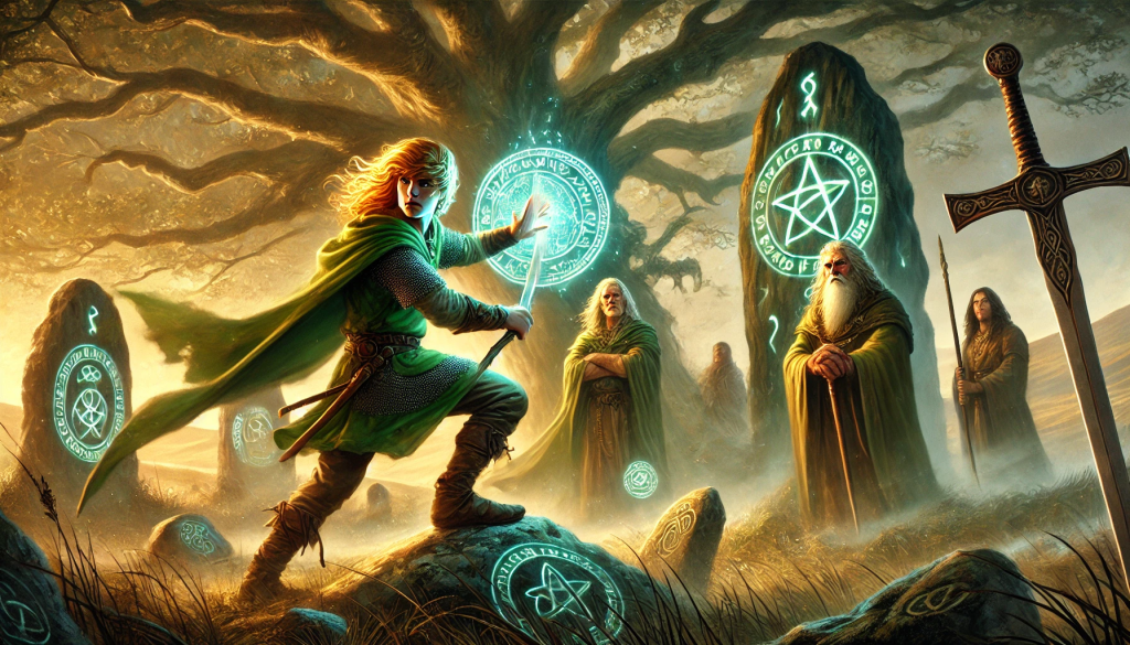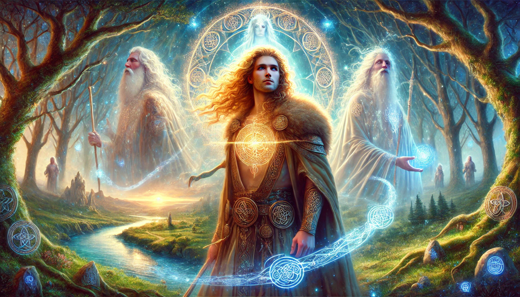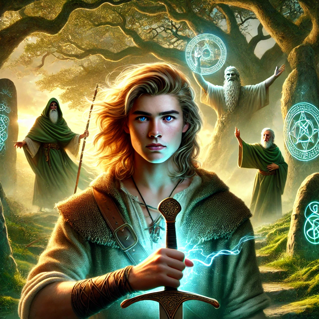 This breathtaking, realistic, and artistic fantasy-style landscape illustration captures young Fin (Fionn mac Cumhaill) in the mystical wilderness of ancient Ireland, where he trains under the guidance of wise druids to master both combat and druidic magic. In the foreground, a youthful Fin with long golden hair and piercing blue eyes wields a wooden training sword poised with natural agility. His other hand glows faintly with supernatural energy, symbolizing his growing connection to the Otherworld. Druids in flowing green robes stand nearby, their expressions wise and mysterious, observing his training as they whisper the secrets of nature and magic. The background is alive with mysticism, featuring towering ancient oak trees, standing stones inscribed with glowing Celtic runes, and a golden mist drifting through the forest, hinting at the unseen spirits guiding his path. The atmosphere is sacred learning and hidden power, marking Fin’s transformation from a young boy into a warrior-seer, destined for greatness.