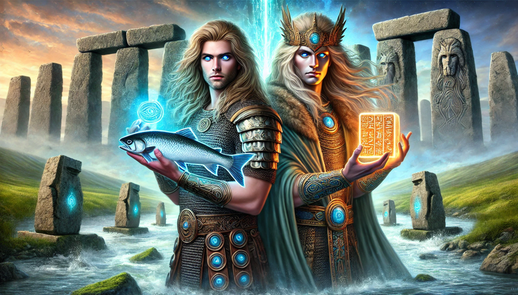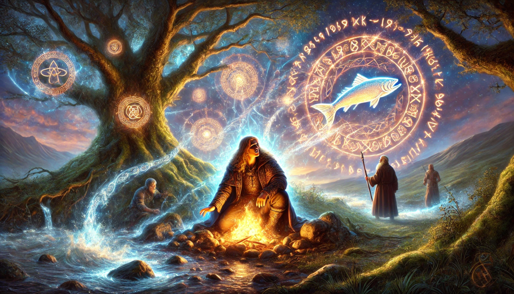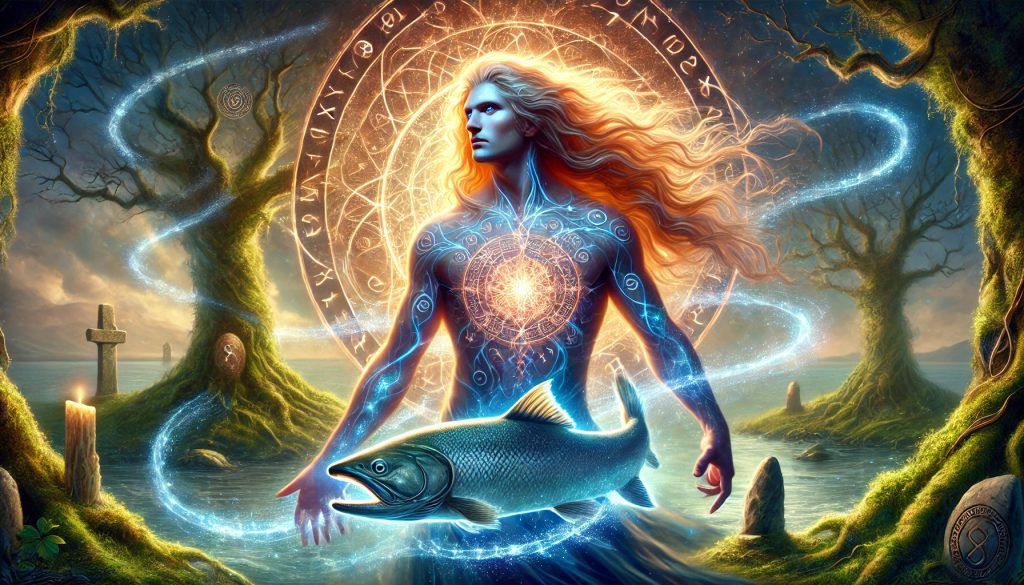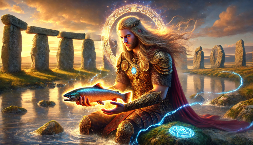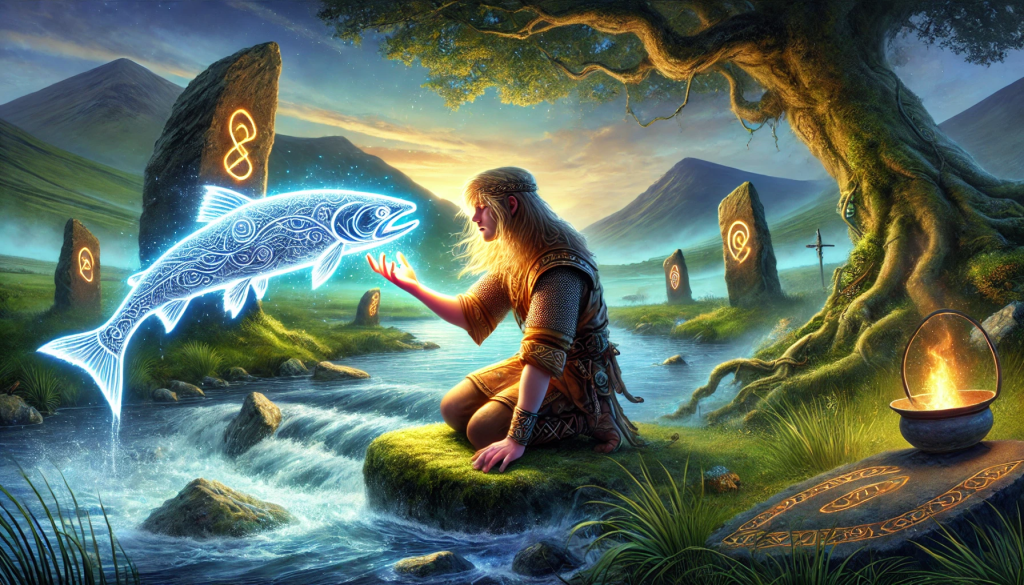 As Fin accidentally touches the hot salmon, he instinctively places his burned thumb in his mouth—his piercing blue eyes widening as divine knowledge floods his mind. A supernatural glow envelops him, and the river and sky radiate ethereal light, marking the instant he gains the ability to see the past, present, and future. The air crackles with mystical energy, and ancient Celtic runes shimmer faintly on nearby standing stones, reinforcing Fin’s transformation into a seer and enlightened being—an Enki avatar gifted with foresight and knowledge.