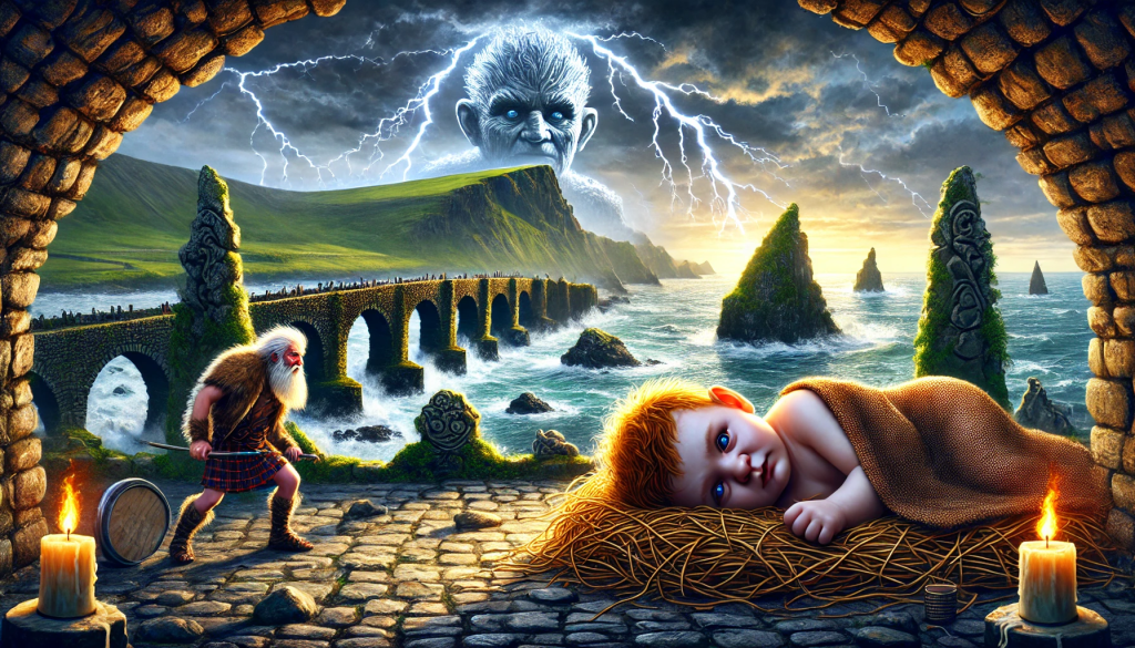 This breathtaking, realistic, and artistic fantasy-style illustration captures the legendary tale of Fin (Fionn mac Cumhaill) and the Scottish giant Benandonner. Inside a stone-built Celtic home, Fin disguises himself as a giant baby, wrapped in large woven blankets in an oversized cradle. His golden hair and piercing blue eyes peek through, as he pretends to sleep. At the doorway, Benandonner, a colossal and menacing figure, looms in shock and fear, his expression twisted with disbelief as he gazes at the supposed ‘infant.’ The sheer size of the child convinces him that Fin’s father must be an unimaginable giant, and panic sets in. Beyond the threshold, the Giant’s Causeway stretches toward Scotland, its massive stone formations beginning to crumble as Benandonner hastily retreats, smashing the bridge behind him to ensure Fin cannot follow. The air hums with supernatural energy, blending humor and myth, emphasizing Fin’s cunning intelligence and divine presence as an avatar of Enki.