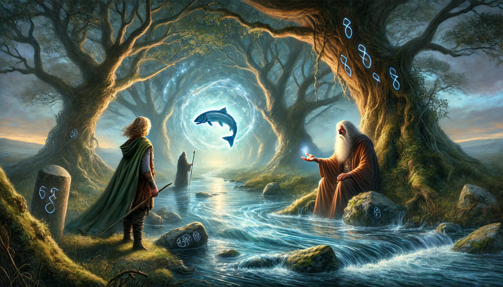 This breathtaking, realistic, and artistic fantasy-style illustration captures the pivotal moment in Fin (Fionn mac Cumhaill)’s life—his secret training under druids and warriors and his accidental consumption of the Salmon of Wisdom. The scene unfolds in a mystical Celtic grove, surrounded by towering oaks and glowing runes, where ancient knowledge is passed down. At the heart of the illustration, a wise elder druid, cloaked in deep green robes, shares sacred teachings, while a battle-hardened warrior trains Fin in the art of combat. In the foreground, the legendary Salmon of Wisdom leaps from an enchanted river, its scales shimmering with divine energy. With golden hair and piercing blue eyes, Young Fin watches in awe as his fingers brush against the sacred fish, unknowingly absorbing profound insight and prophetic abilities. The moment is infused with mystical energy, bridging the realms of men and gods. Fin transforms into a legendary warrior, poet, and seer—an avatar of Enki, destined to guide and protect humanity.