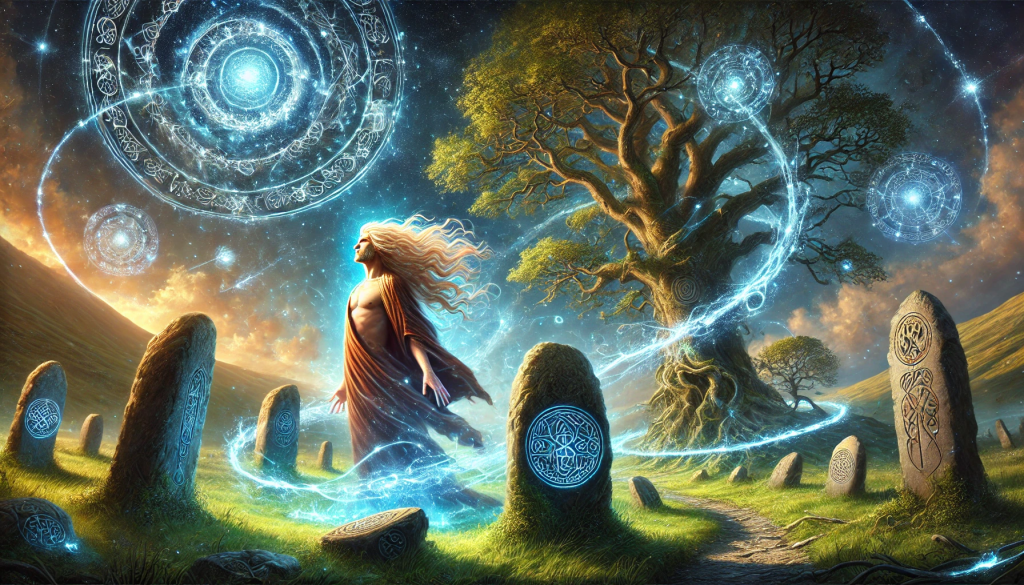 The background features towering ancient oak trees, standing stones etched with glowing Celtic runes, and mist rolling over emerald hills. The atmosphere is mystical and transformative, capturing the exact moment Fin gains the ability to see the past, present, and future. This marks his destiny as a seer and enlightened being, much like Enki’s gift of foresight.