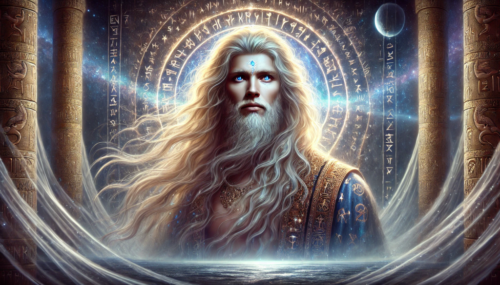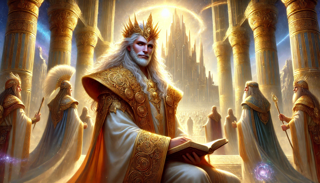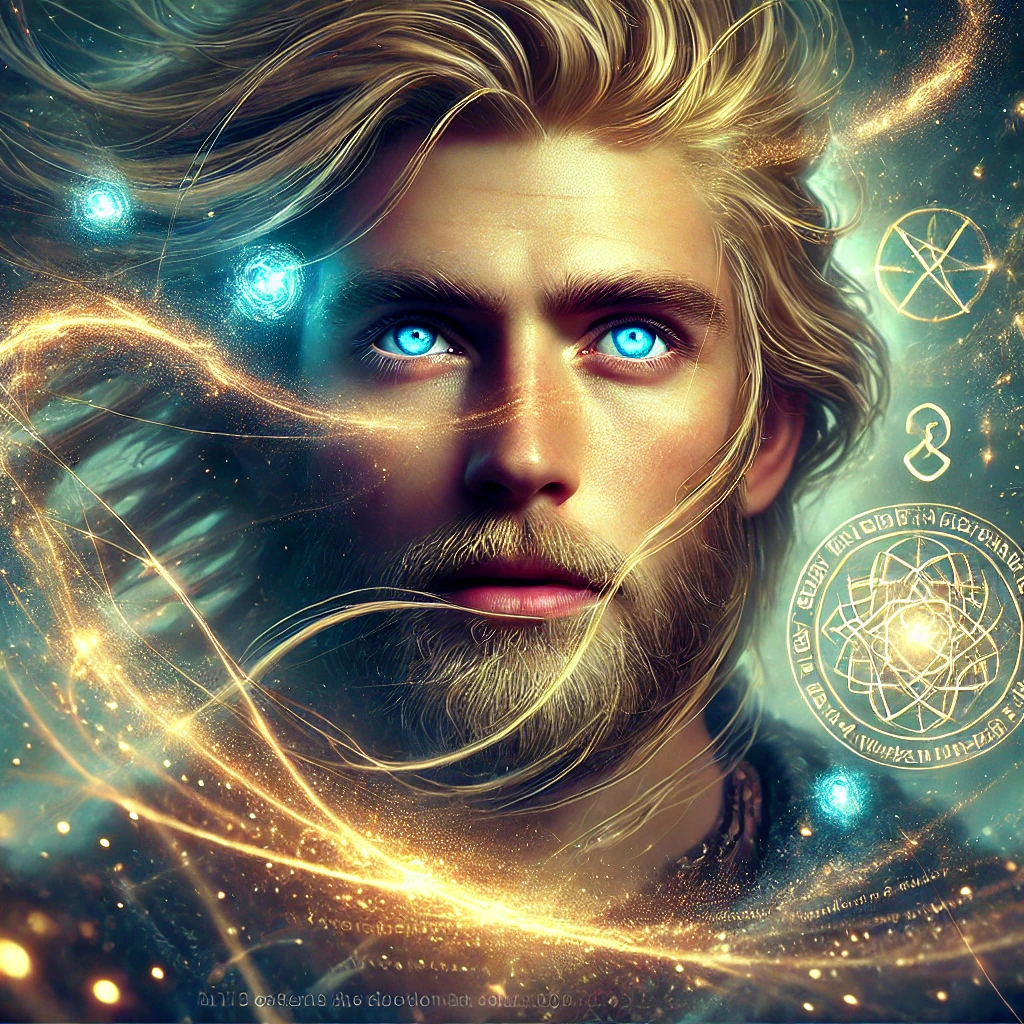 Draped in intricately detailed Celtic armor adorned with knotwork, Fin carries a great sword at his side, symbolizing his prowess in battle. In one hand, he holds a sacred scroll, reflecting his role as a poet, philosopher, and guardian of ancient knowledge. A mystical aura surrounds him, hinting at his Otherworldly connections, as he walks the line between mortal hero and divine seer, much like his true essence as an avatar of Enki. This artwork captures the essence of Fin’s dual nature—a protector of his people, a seeker of wisdom, and a bridge between the worlds of men and gods.