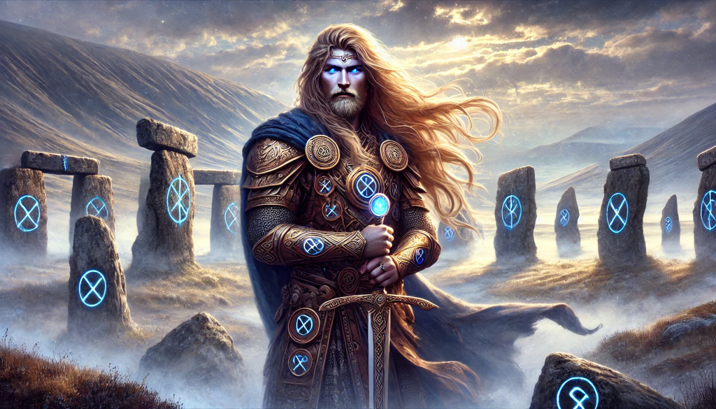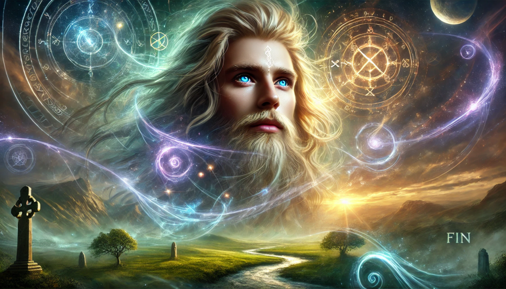 Description: A stunning, realistic, and artistic fantasy-style illustration of Fin (Fionn mac Cumhaill), the legendary Irish warrior, poet, and seer. He stands amidst a misty Celtic landscape, surrounded by rolling emerald hills and ancient standing stones, embodying the mythic grandeur of the Fenian Cycle. His long golden hair flows in the wind, and his piercing blue eyes radiate deep wisdom and supernatural insight.