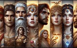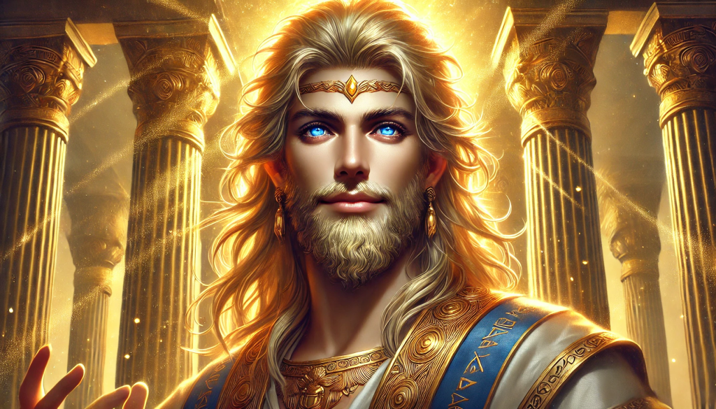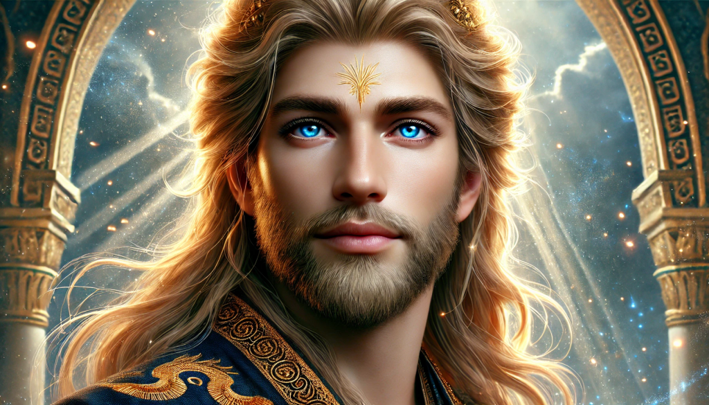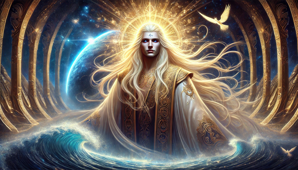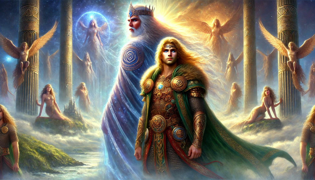 In a radiant, otherworldly realm, Fin stands illuminated by golden light, his flowing golden hair and piercing blue eyes reflecting his noble and semi-divine heritage. Around him, the Tuatha Dé Danann emerge from the mist, their luminous auras exuding wisdom and power. These ethereal beings, robed in celestial light, represent the divine lineage transcending history and time.