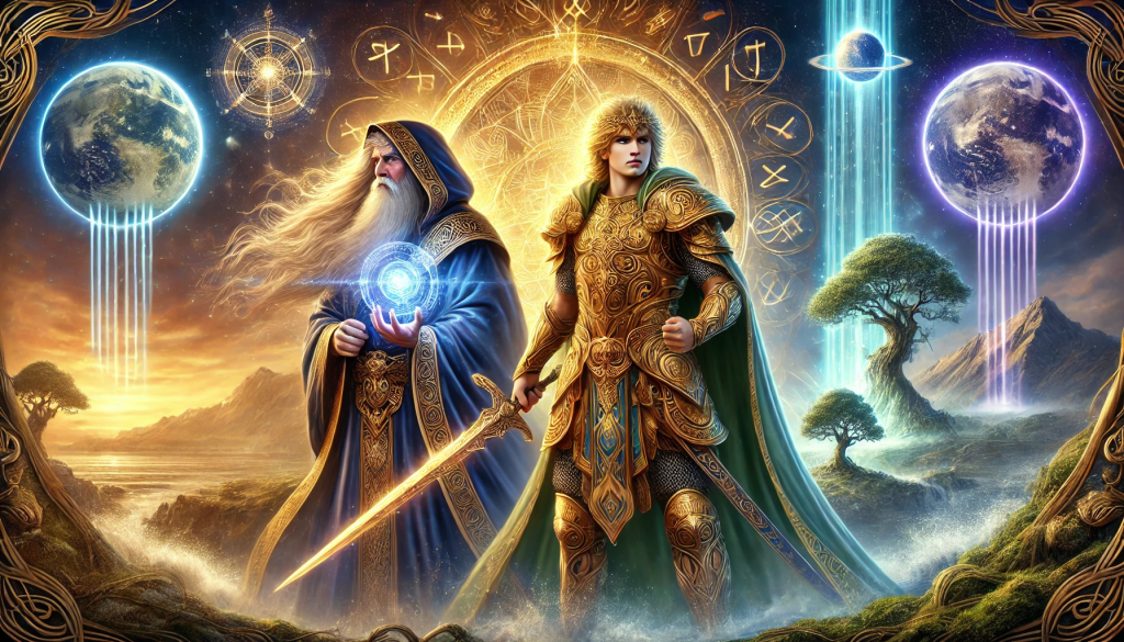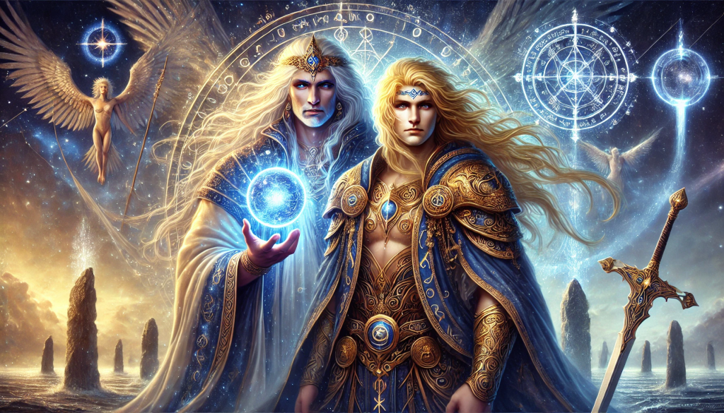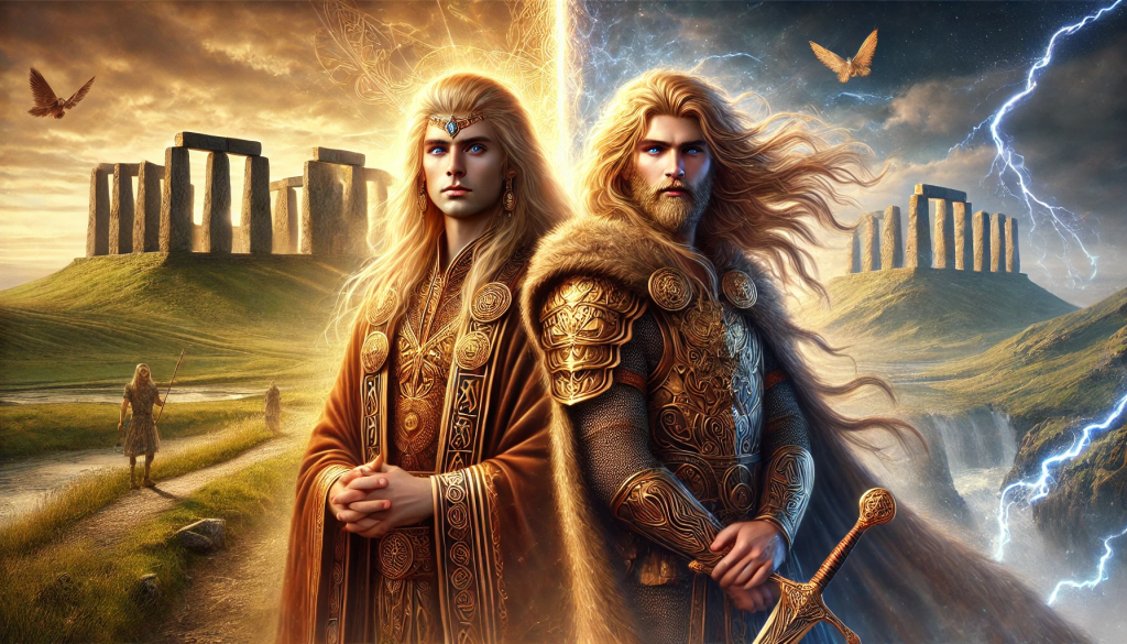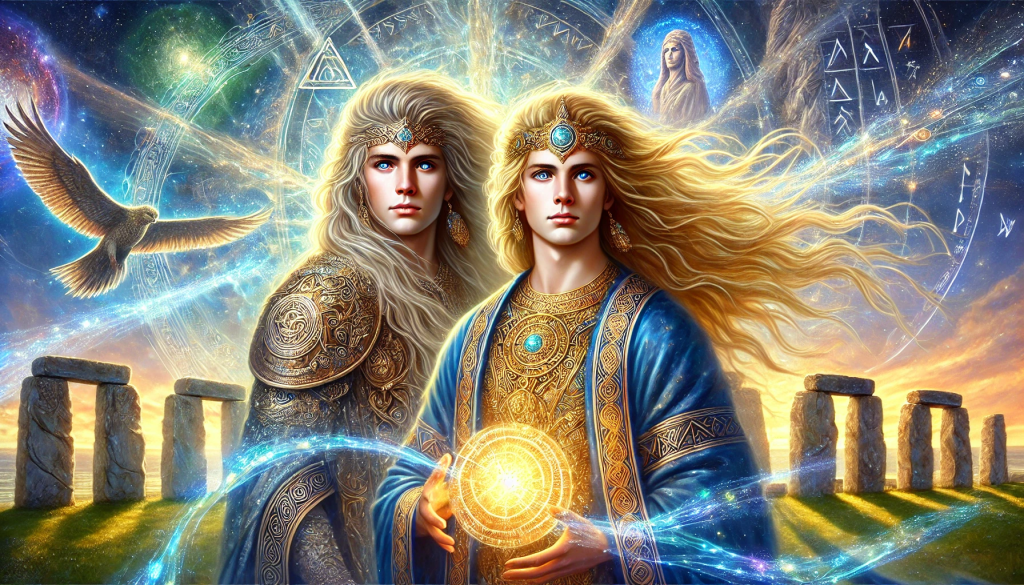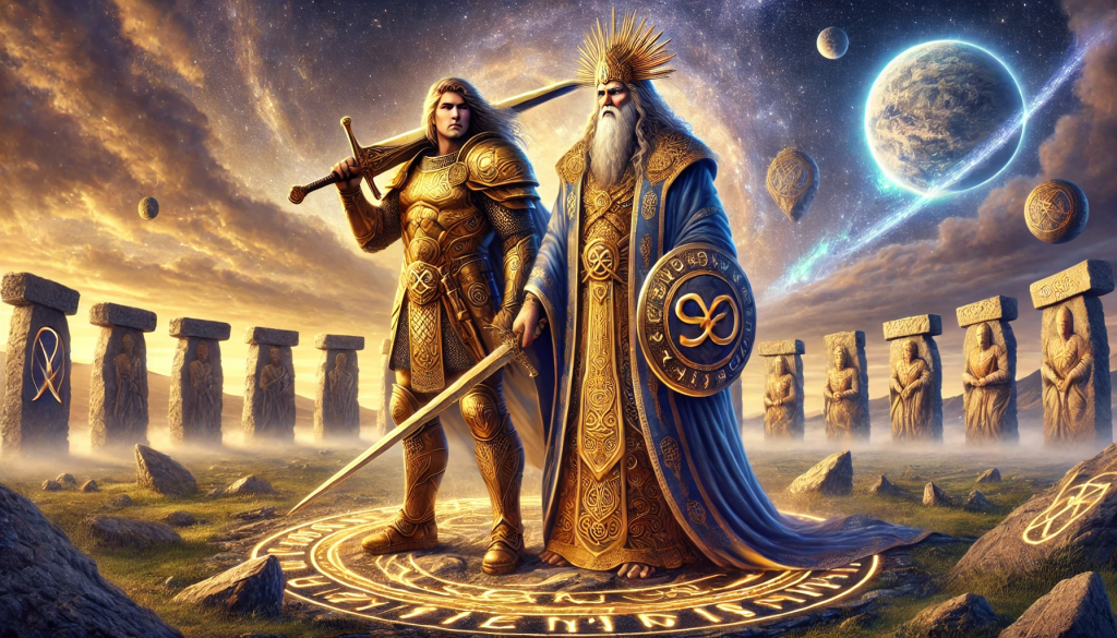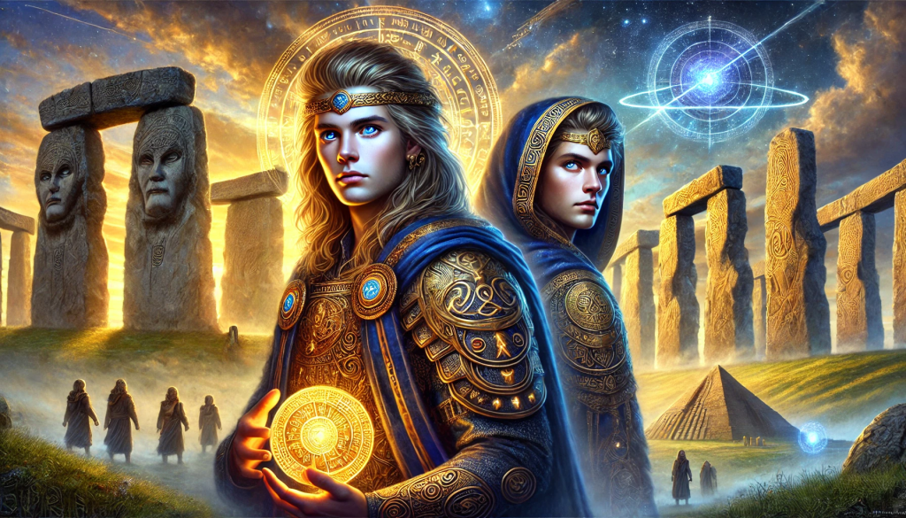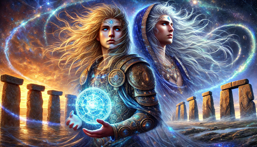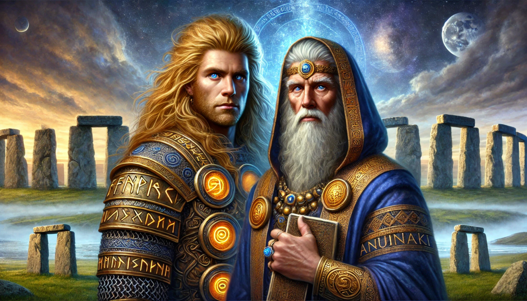 Enki and Fin stand side by side in this powerful and mystical illustration, embodying their connection to the Tuatha Dé Danann. Enki, the Anunnaki god of wisdom, wears flowing blue and gold robes inscribed with celestial symbols, his piercing blue eyes radiating divine knowledge. His lighter blonde hair flows like liquid starlight as he holds a glowing orb of ancient power. Beside him, Fin, the golden-haired leader of the Fianna, stands adorned in ornate Celtic armor engraved with luminous runes, his sharp blue eyes filled with the fire of leadership. Behind them, an ethereal landscape merges the realms of Irish and Anunnaki mythology—standing stones inscribed with glowing symbols rise from mist-covered waters, while celestial beings soar in the illuminated sky. This image captures the profound bond between warrior and sage, protector and guide, shaping the destiny of both Earth and the unseen realms.