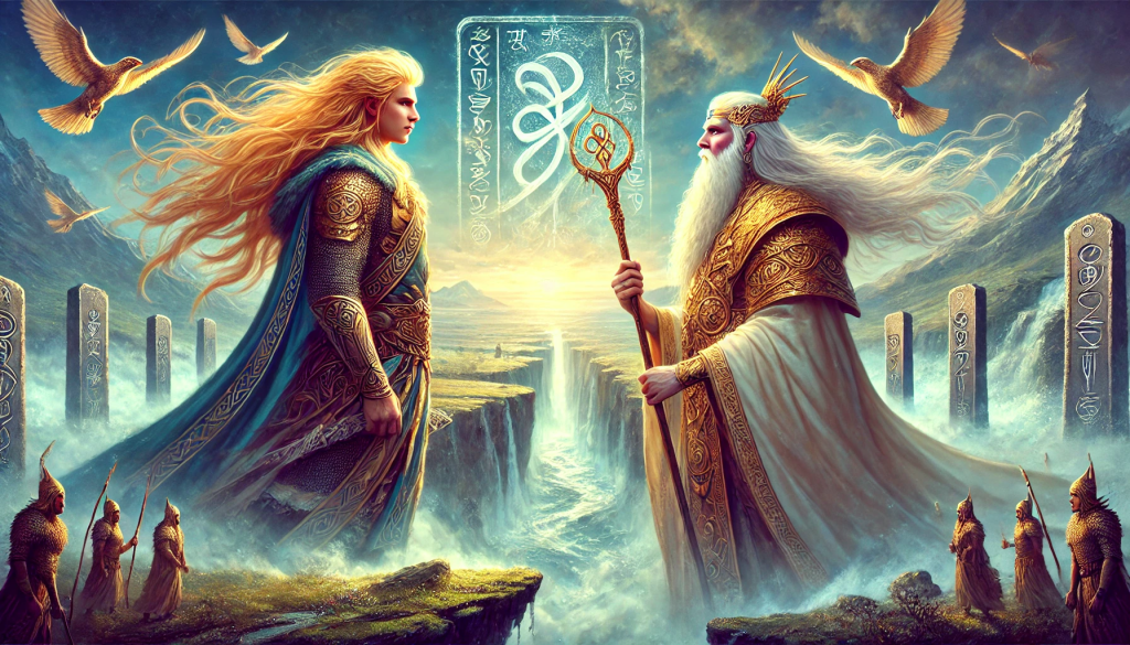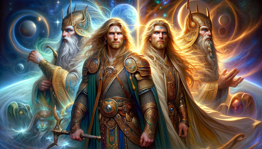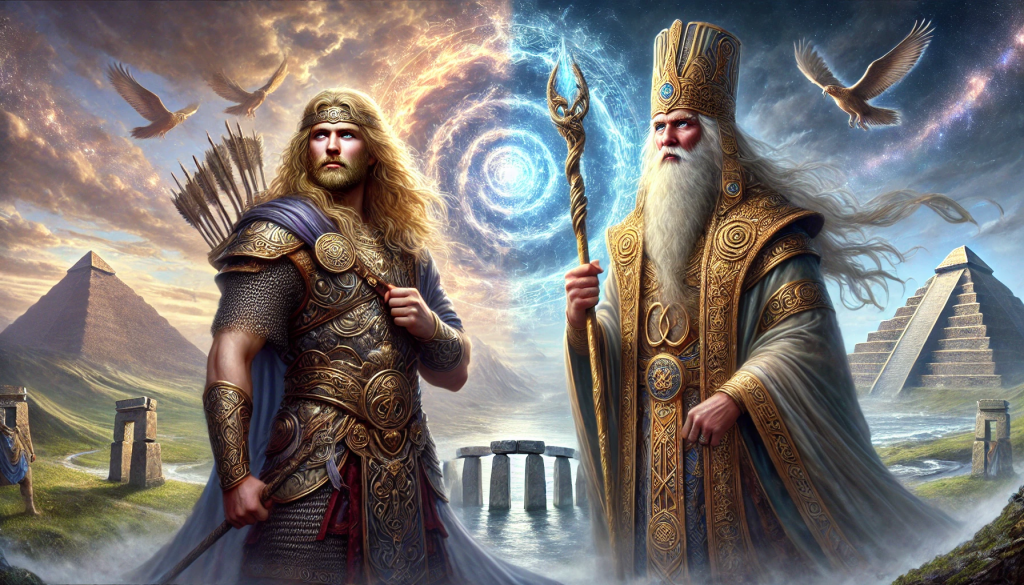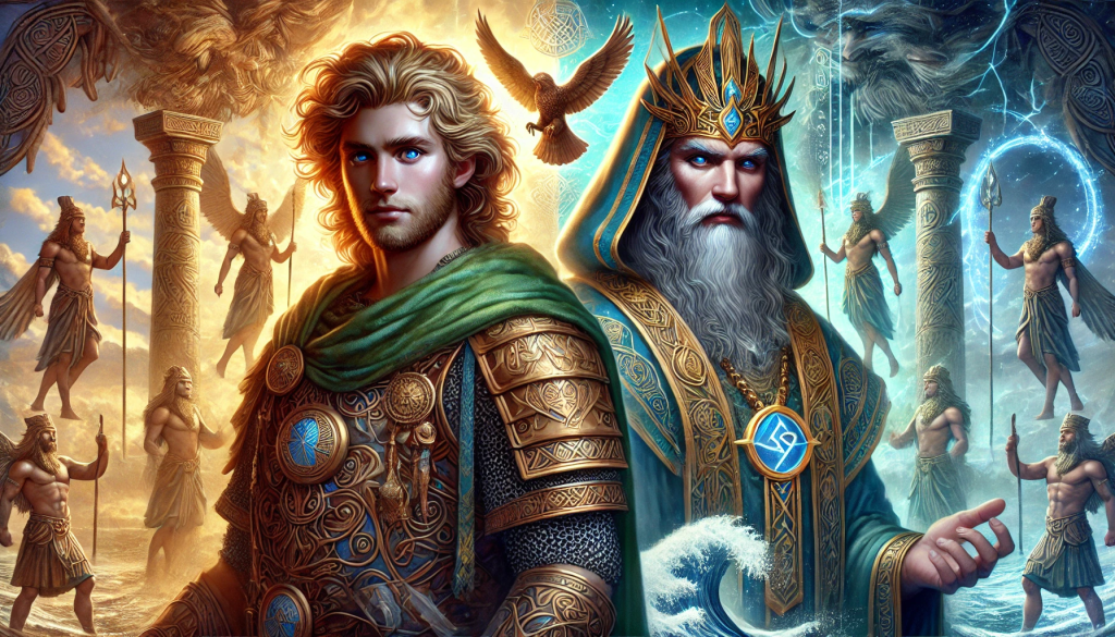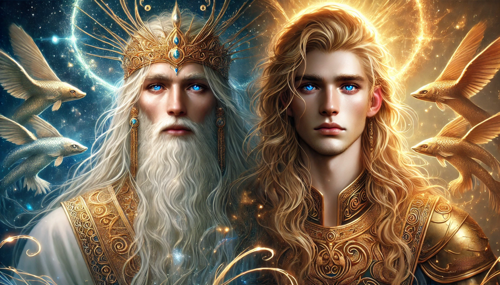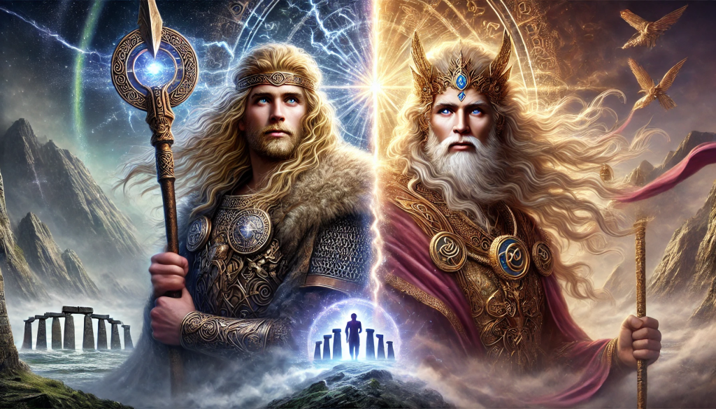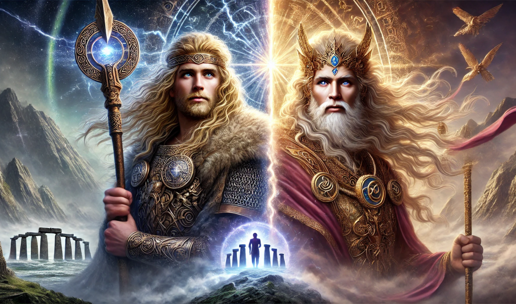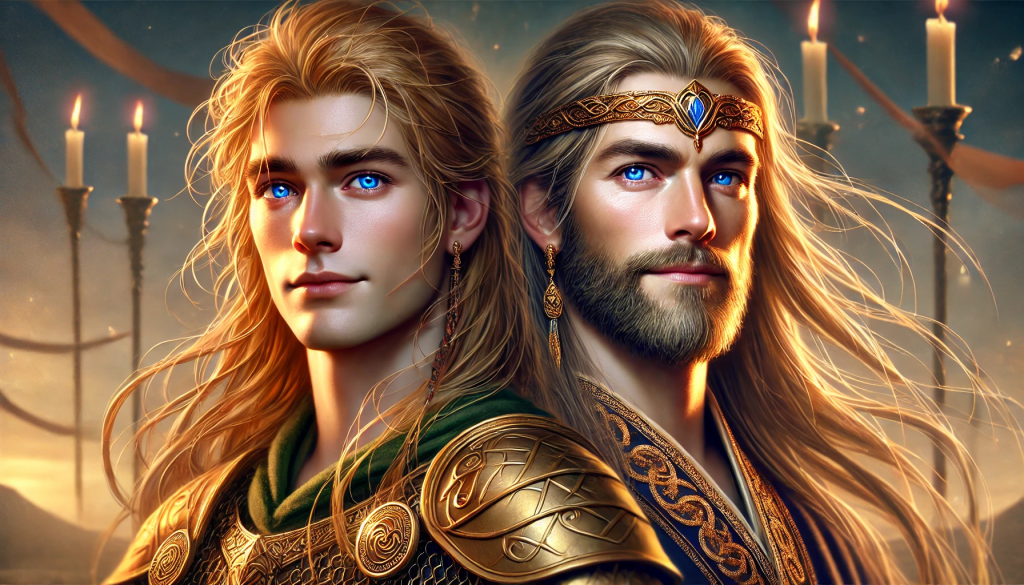 Enki and Fin stand side by side in this powerful and mystical illustration, embodying their connection to the Tuatha Dé Danann. Enki, the Anunnaki god of wisdom, wears flowing blue and gold robes inscribed with celestial symbols, his piercing blue eyes radiating divine knowledge. His lighter blonde hair flows like liquid starlight as he holds a glowing orb of ancient power. Beside him, Fin, the golden-haired leader of the Fianna, stands adorned in ornate Celtic armor engraved with luminous runes, his sharp blue eyes filled with the fire of leadership. Behind them, an ethereal landscape merges the realms of Irish and Anunnaki mythology—standing stones inscribed with glowing symbols rise from mist-covered waters, while celestial beings soar in the illuminated sky. This image captures the profound bond between warrior and sage, protector and guide, shaping the destiny of both Earth and the unseen realms.