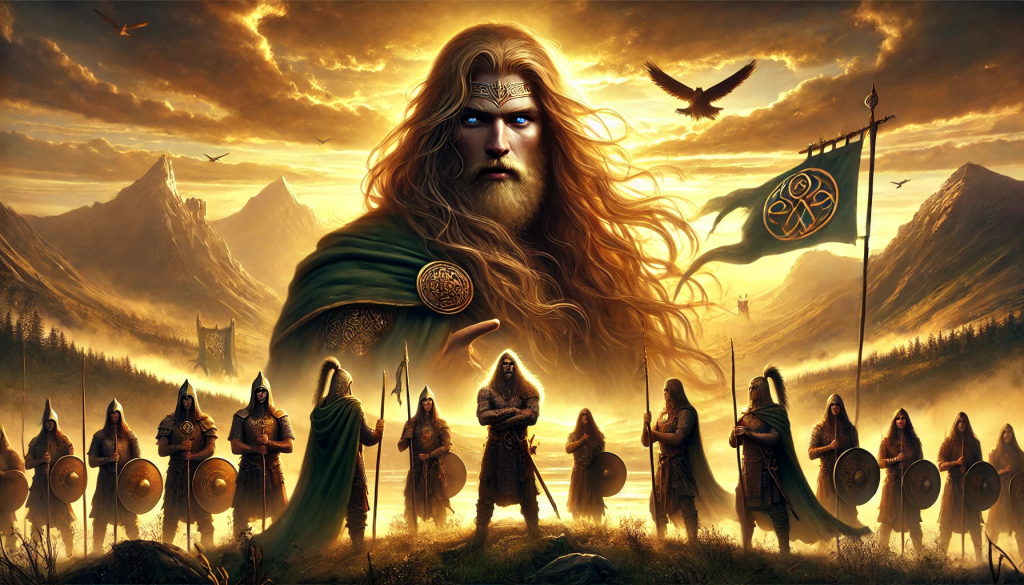 A breathtaking, realistic, and artistic fantasy-style illustration capturing Fin (Fionn mac Cumhaill), one of the most iconic figures in Irish mythology. He stands proudly as the legendary leader of the Fianna, a band of elite warriors dedicated to protecting Ireland in the pre-Christian era. His golden hair flows in the wind, and his piercing blue eyes radiate divine wisdom and strength, reflecting his otherworldly heritage.