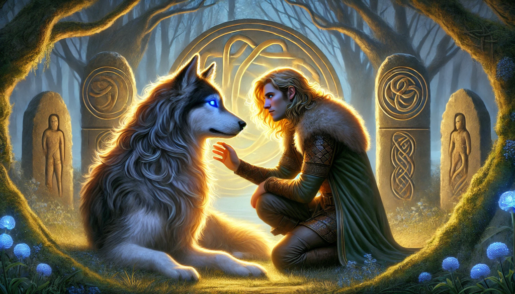 In a heartwarming moment of deep connection, Fin, the noble warrior with flowing golden hair and piercing blue eyes, kneels beside his enchanted hound, Bran. The majestic wolf-like hound gazes back at him with glowing blue eyes, radiating loyalty and intelligence. Soft, ethereal light bathes the scene in a mystical forest where ancient Celtic symbols are carved into standing stones, hinting at the magic that binds them. Fin’s hand gently touches Bran’s fur, symbolizing their unbreakable bond as warrior and hound-son. The atmosphere is serene and warm, capturing the timeless companionship between them.