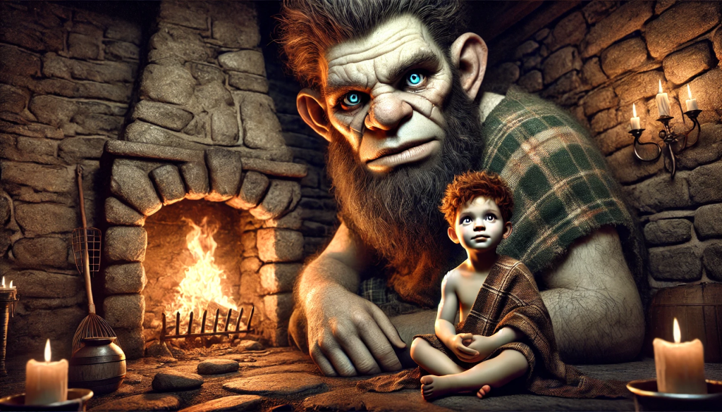 This breathtaking, realistic, and artistic fantasy-style close-up illustration captures the legendary moment of Fin (Fionn mac Cumhaill) deceiving the Scottish giant Benandonner with his brilliant disguise.