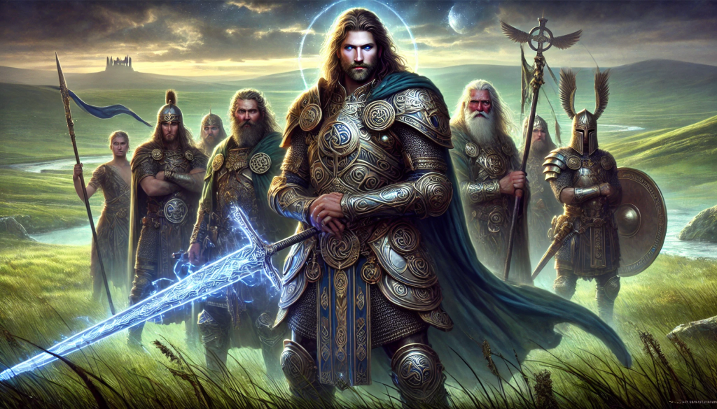 Surrounding him, the Fianna warriors stand ready, clad in intricately detailed Celtic armor, their shields and swords gleaming beneath an ethereal golden light. The rolling emerald hills stretch into the horizon, punctuated by ancient standing stones, hinting at the connection between Fin, the Otherworld, and the divine. Above, the sky swirls with storm clouds and radiant sunbeams, symbolizing Fin’s role as a mortal hero and a guardian chosen by fate.