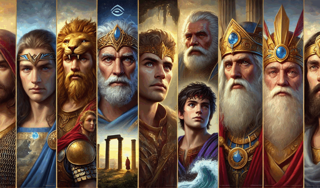 From the golden dawn of epic to the twilight of ancient truths, these men represent the spectrum of strength, kingship, and divine heritage. Heracles, bold and lion-cloaked, embodies heroic might and sacrifice. Beside him, Telamon, the seasoned king, stands with the gravity of command and hard-won loyalty. Laomedon, stern and proud, wears the burden of broken oaths and royal legacy. Priam (Podarces), youthful and noble, glows with the unspoken weight of survival and future rule. And at the edge of time, Enki, wise and elemental, watches with eyes that know the rise and fall of civilizations. Together, they are the mythic masculine across cultures—flawed, fated, and immortal in story.