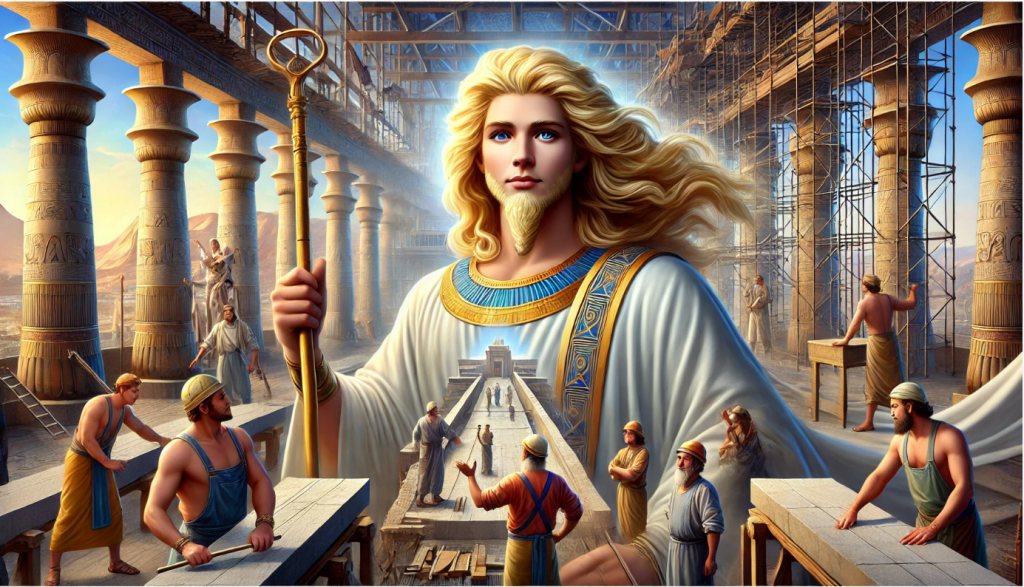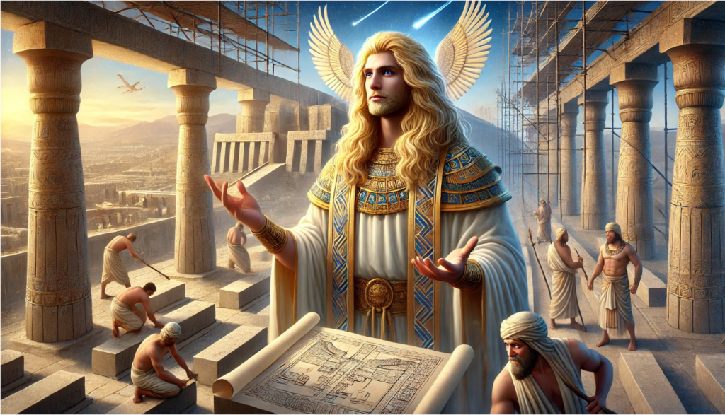 Ptah oversees the construction of a grand temple from a raised platform, symbolizing his role as the master architect and creator of ancient wonders. Let me know your thoughts or if further adjustments are needed!