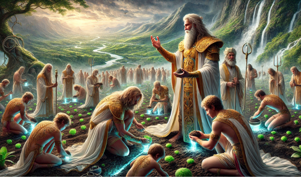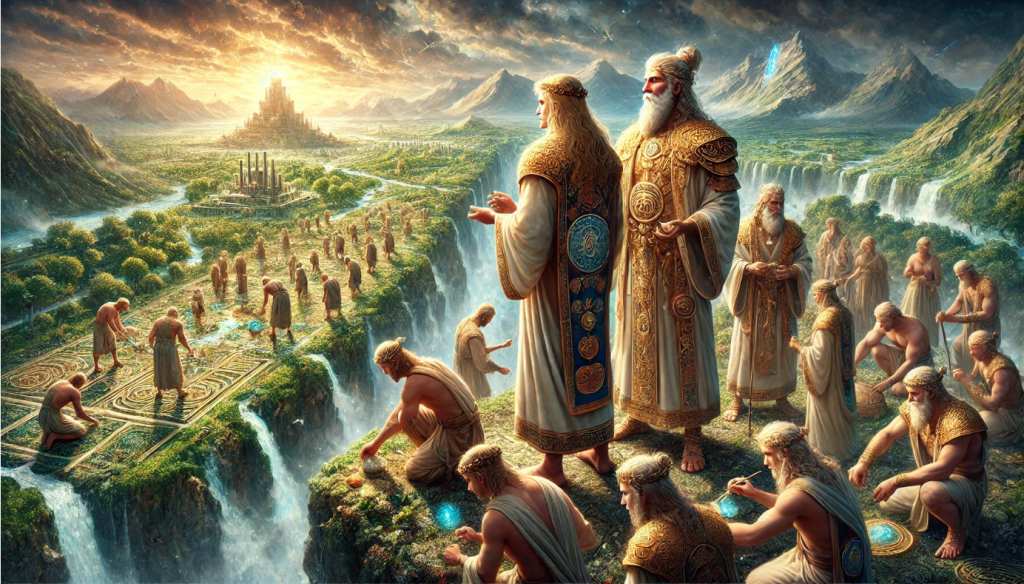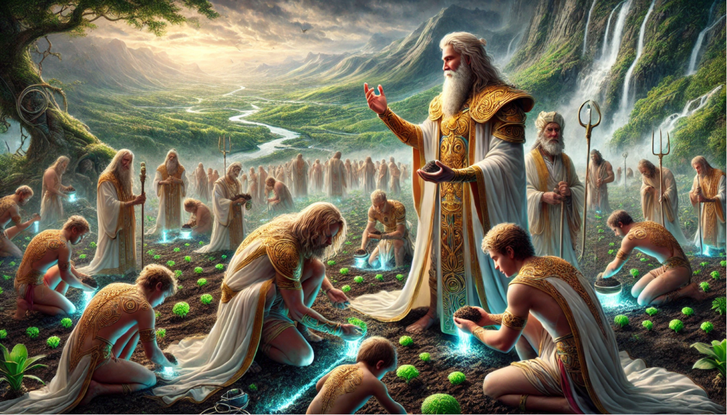 Enki’s ingenuity shone as he overcame Earth’s harsh conditions, designing life-supporting technologies and managing the challenges of the mission. His deep connection to Earth’s natural beauty and vitality inspired him to see the planet as more than a resource—it became a sanctuary. Enki’s affinity for Earth led him to teach humanity the basics of civilization, including agriculture, architecture, and astronomy, ensuring the survival and progress of his people and the humans they had created to assist in their work.