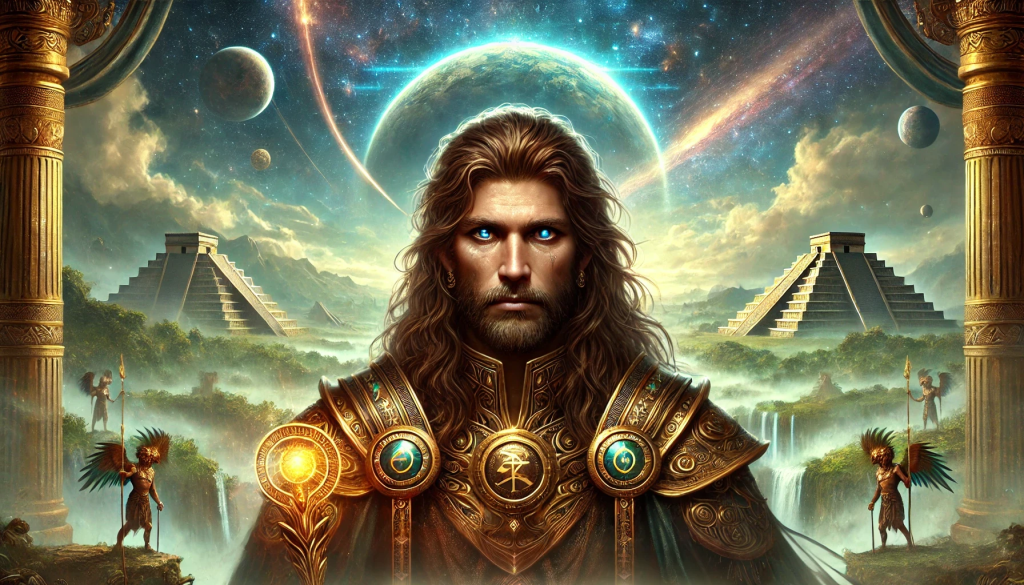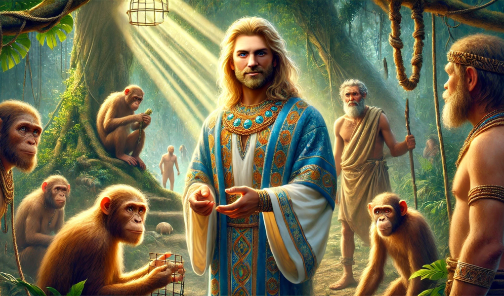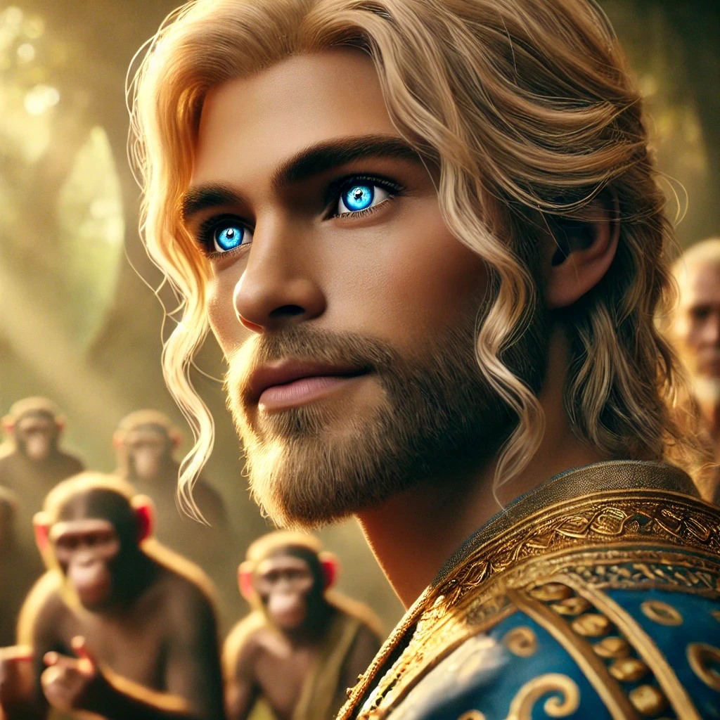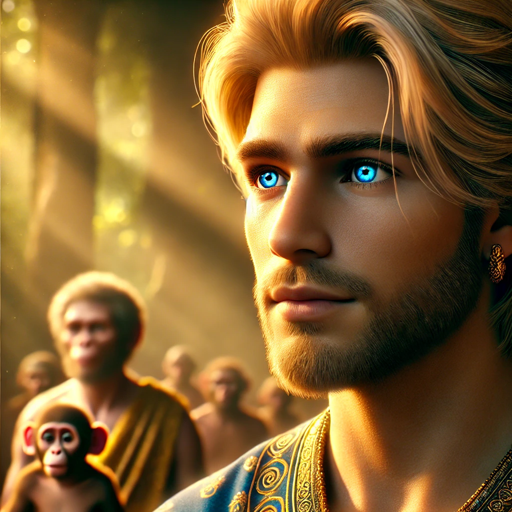 The Awakening of Enki While exploring the Abzu, the sacred cradle of Earth’s life, Enki—an Anunnaki of immense wisdom—witnesses an unexpected act of compassion. Primitive Homo Erectus, though lacking technology and culture, display courage and empathy as they risk their lives to free caged animals. Hidden in the foliage, Enki observes in stunned silence. In this moment, the divine being sees the early spark of the human soul—a glimmer of selflessness that transcends evolution. The scene marks a turning point in his perception of humankind: not as mere creations, but as beings with the potential for greatness.The Eyes of Enki Enki’s face is serene and radiant in this intimate moment, framed by flowing golden hair and a short, noble beard. His bright blue eyes reflect divinity and a deep, emotional response to what unfolds before him. Behind him, faintly visible through jungle light and shadow, Homo Erectus frees a small monkey from captivity. It is a pivotal moment for them, and him, as the god who helped shape mankind sees the seeds of empathy blooming in his creation.