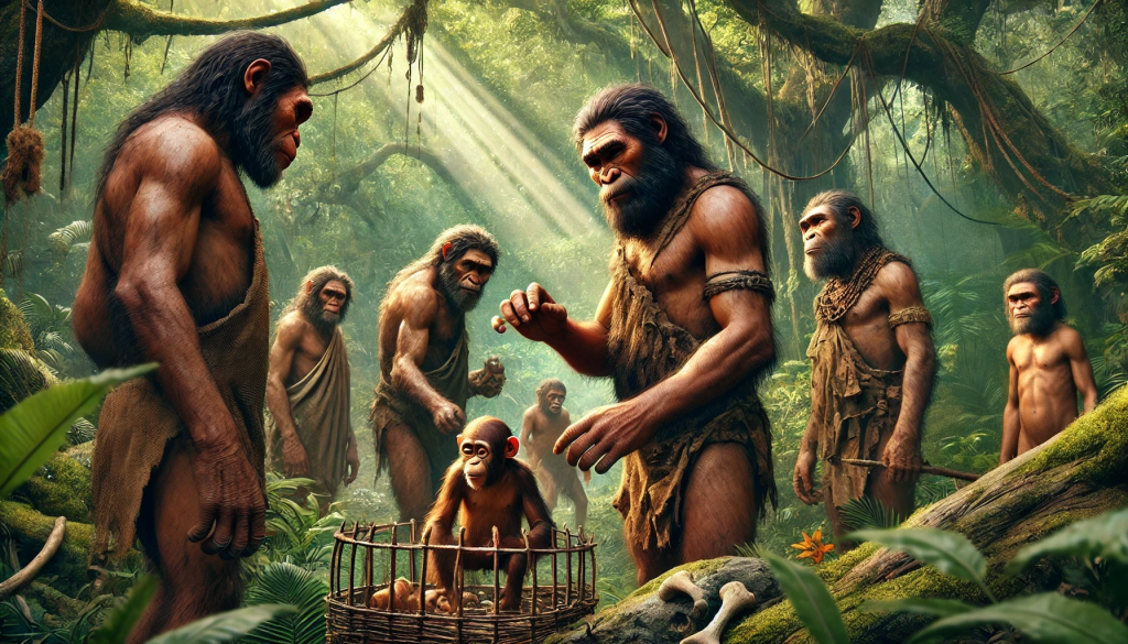 While studying the natural world in the Abzu, Enki witnessed something astonishing — Homo Erectus individuals risking their safety to free caged animals. This act of selfless compassion struck him deeply. These early hominids, primitive by Anunnaki standards, showed empathy — a trait that would become central to the human soul.