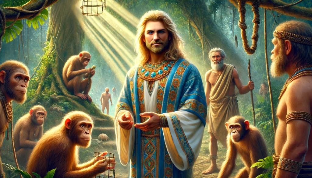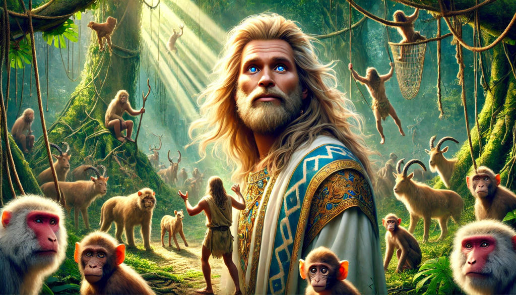 Enki’s Awakening In the heart of a sacred jungle, the Anunnaki god Enki gazes calmly, his vivid blue eyes reflecting the light of understanding. Framed by flowing golden hair and adorned in robes of celestial gold and azure, Enki observes an unfolding moment of empathy—early Homo Erectus freeing animals in the background. Though divine, his expression is deeply human: a mix of wonder, compassion, and revelation. In this still moment, the boundary between creator and creation softens, as